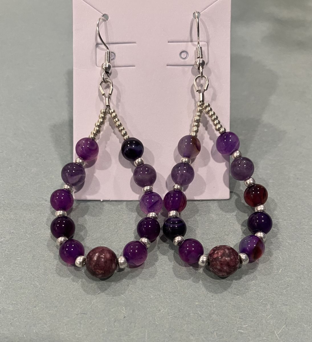 VenmoPurple agate gemstone, beaded stretch bracelet with a decorative rhinestone silver charm and matching 2.4 inch long, tear drop dangle earrings. Ear wires are silver plated. Bracelet wrist size is a medium, up to 7 inches. Gift box included. Local meetup or can mail with ship fee.