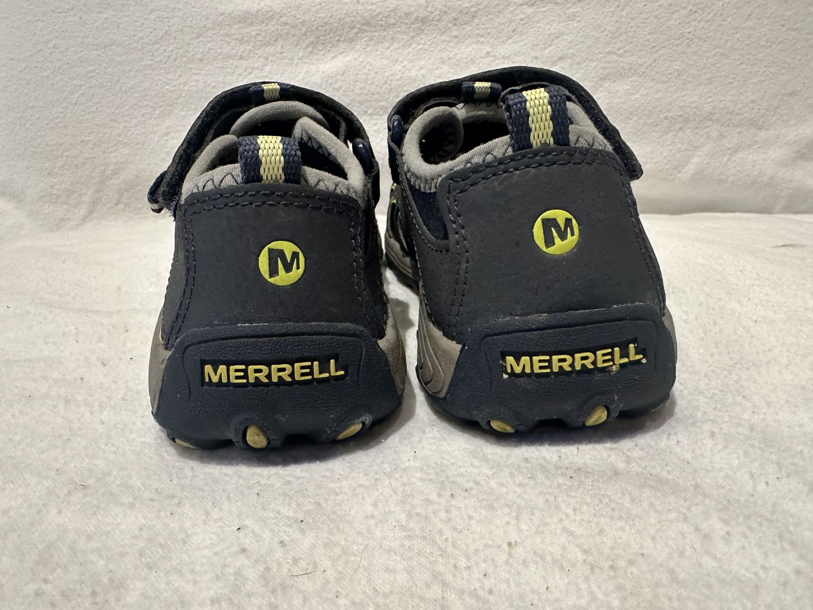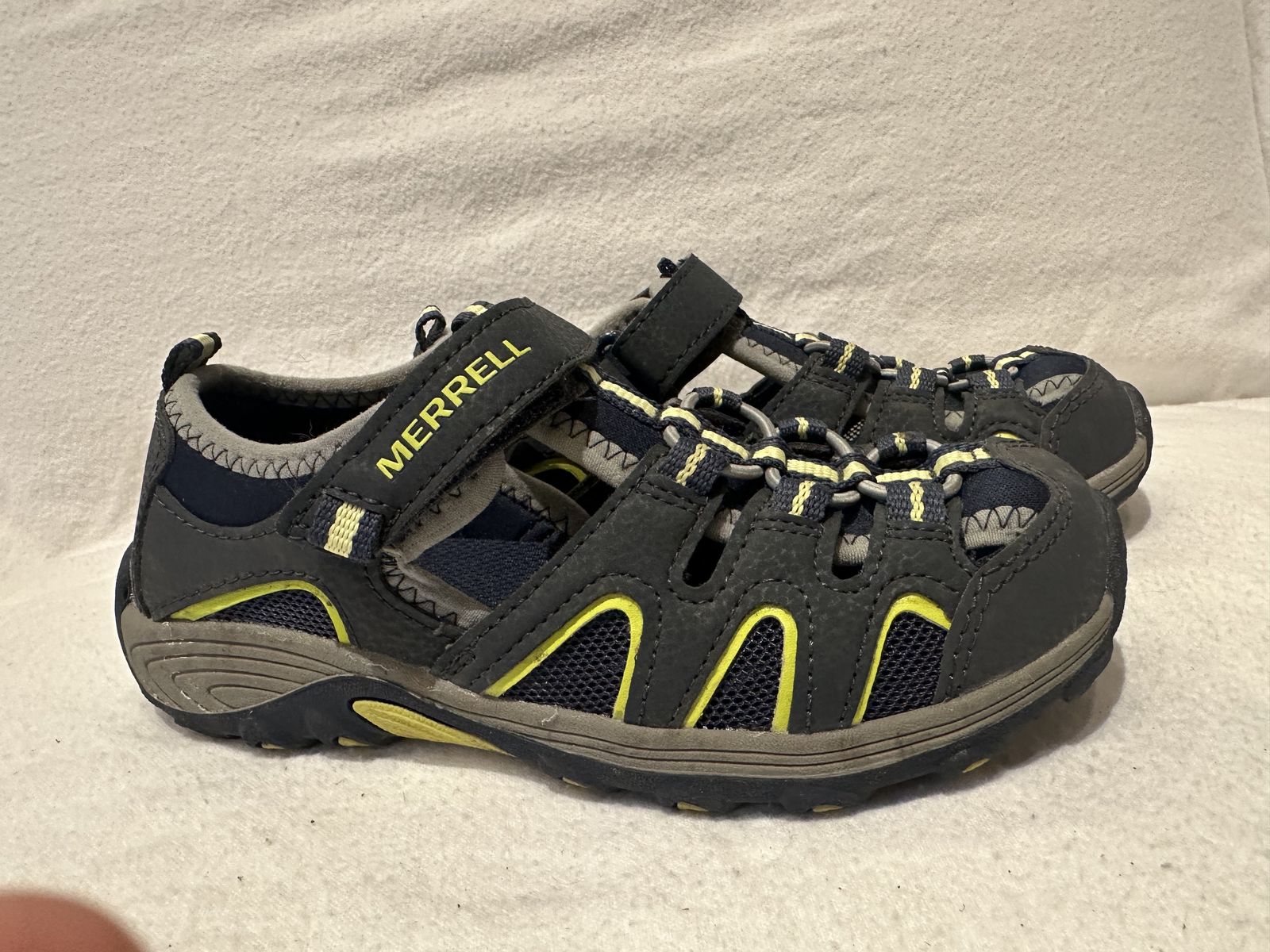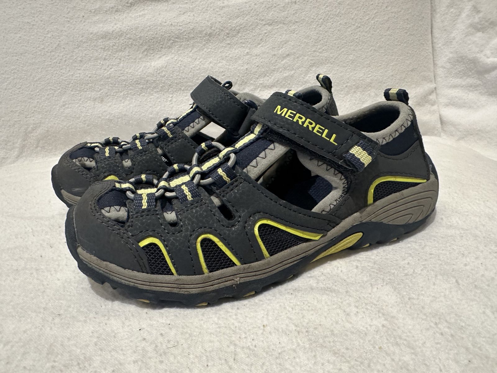 Merrell youth size 1 navy/gray/yellow water or hiking sandals. These are the closed toe style. They are in excellent condition, see photos for details. I take cash or Venmo, but cash is preferred. Text is best. 801-201-4446. Check out my other ads for additional sizes and styles.