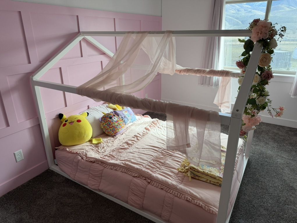 VenmoItem includes: white wood frame, mattress, cover, decorations on frame. Full size bed. Zip-on mattress cover and top blanket.