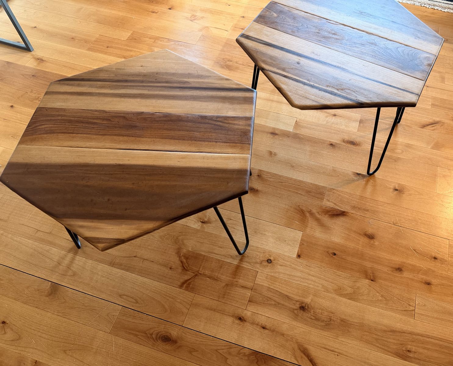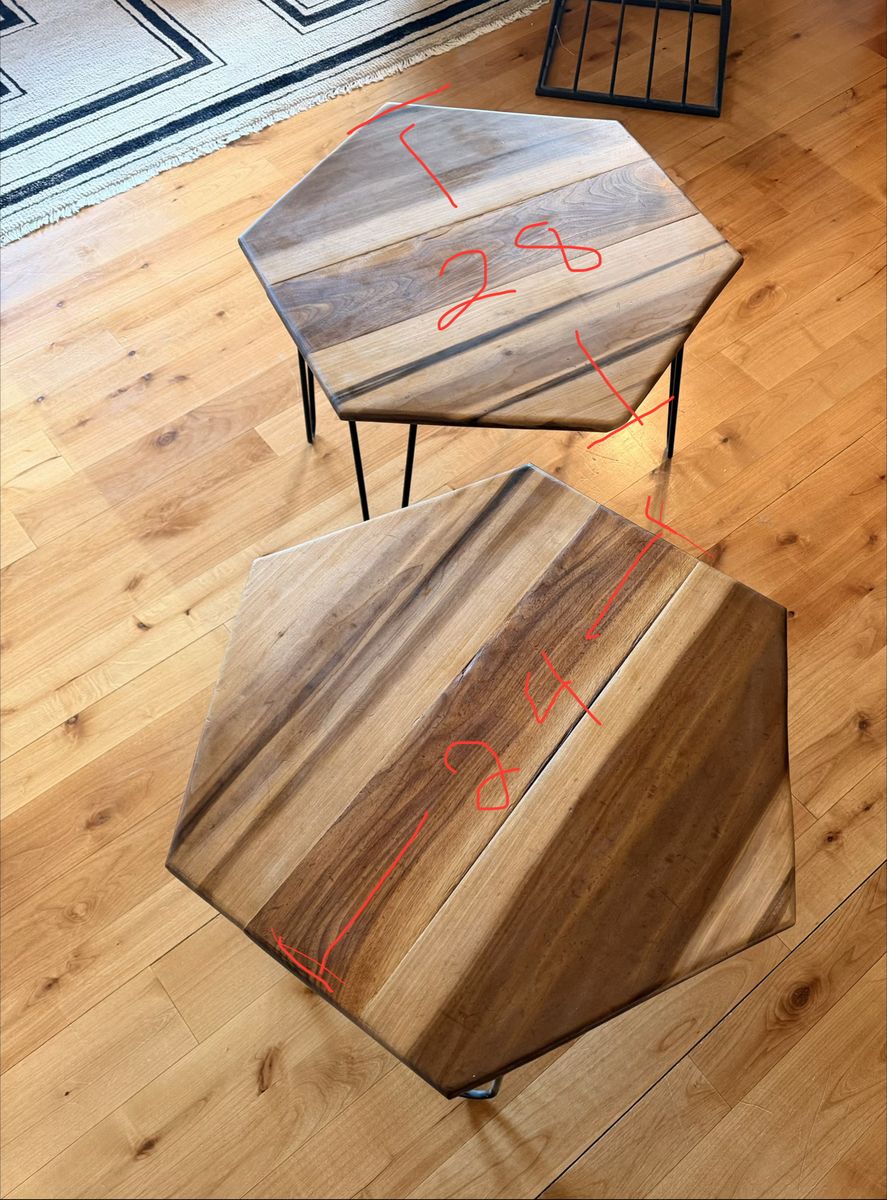 VenmoTables are a combination of walnut and poplar wood with hairpin legs. Stand 17” tall, and are 24”x28” (widest point) on top. Price for both tables, cash or Venmo. Porch pickup available.