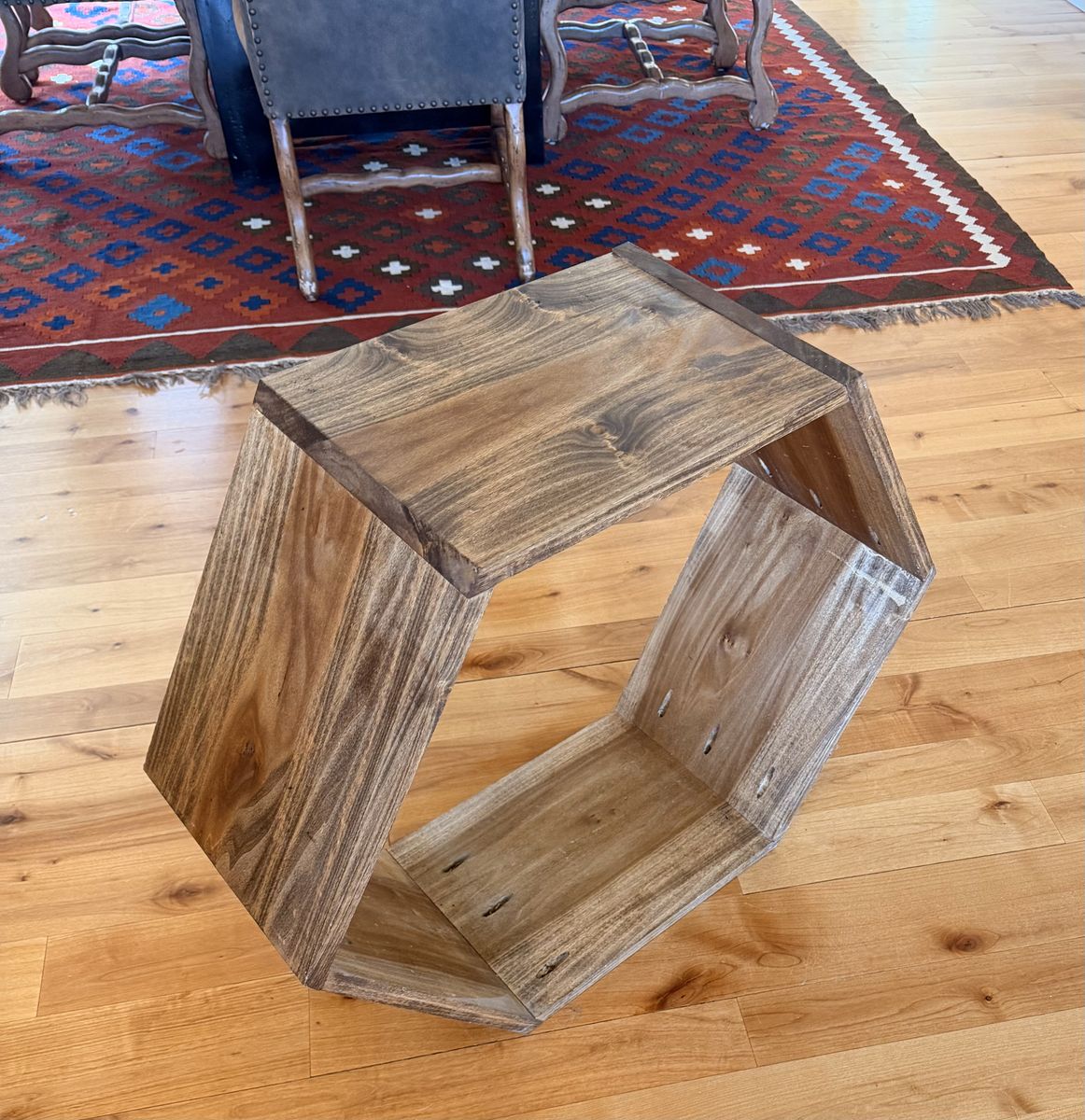 VenmoHexagon wood firewood holder for fireplace. Holds a good amount of firewood. A little over 25” tall and 30” wide.