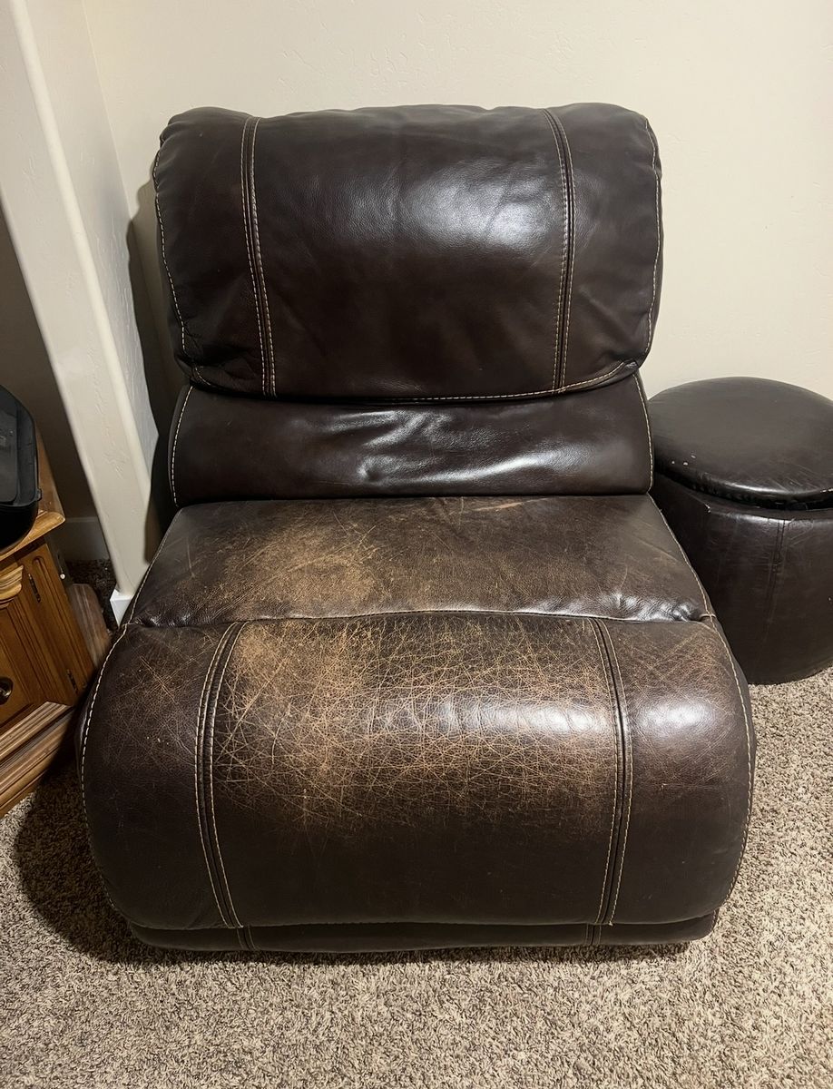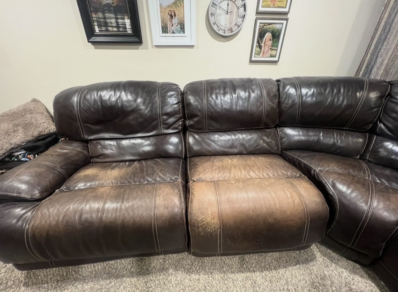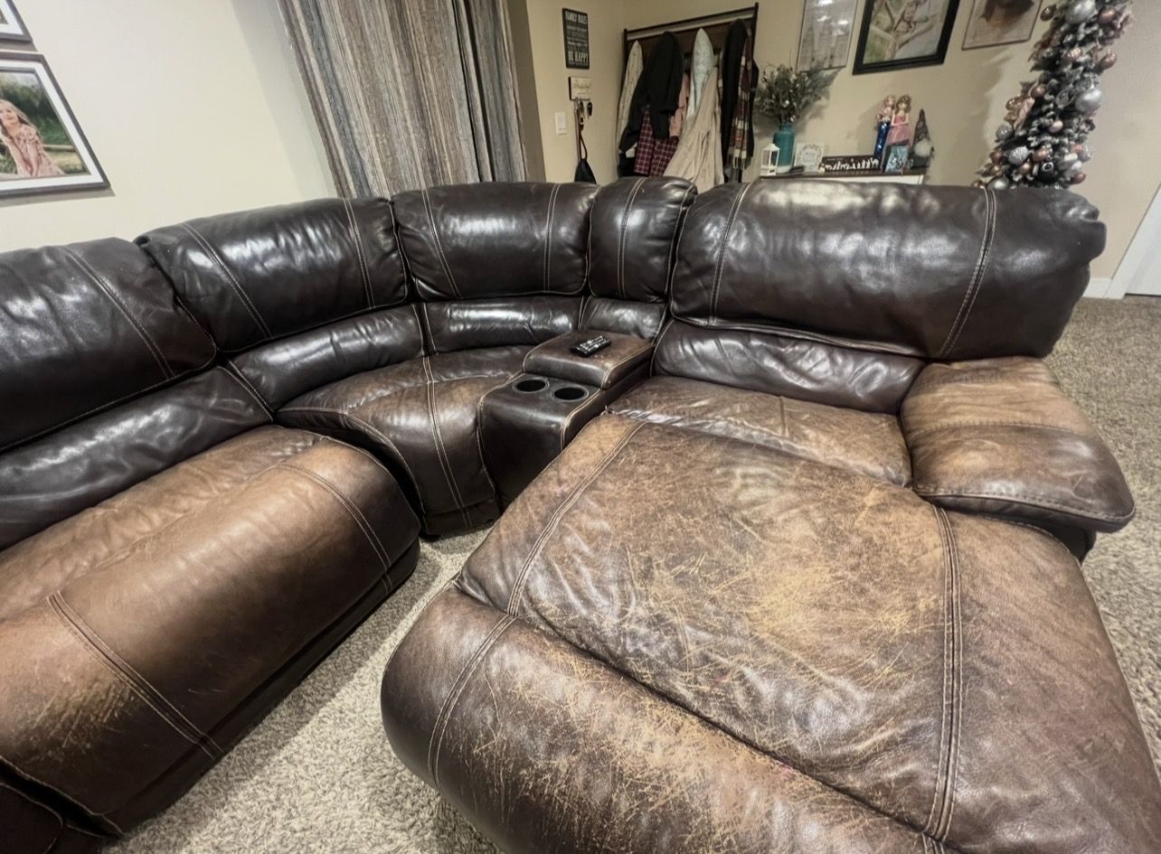 ApplePayLarge 6 piece leather sectional. Has been well used but is in great shape. Pictured is 5 of the 6 pieces together. It’s modular and can be configured many different ways to fit any space! Has a large chaise end piece that is great to lay on. All pieces are recliners. The chaise piece can recline back and goes back when you lean on it. Small ottoman can be included. There’s a rip on the inside of the center console, but can’t be seen when configured. Moving next week and needs to be gone! $250 OBO