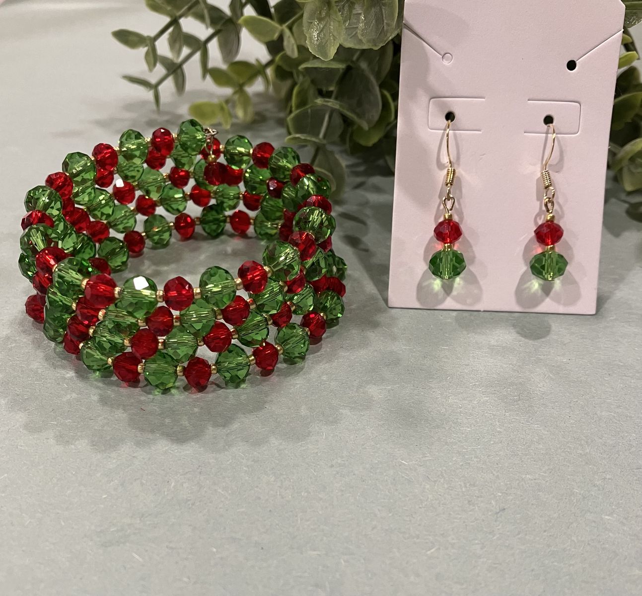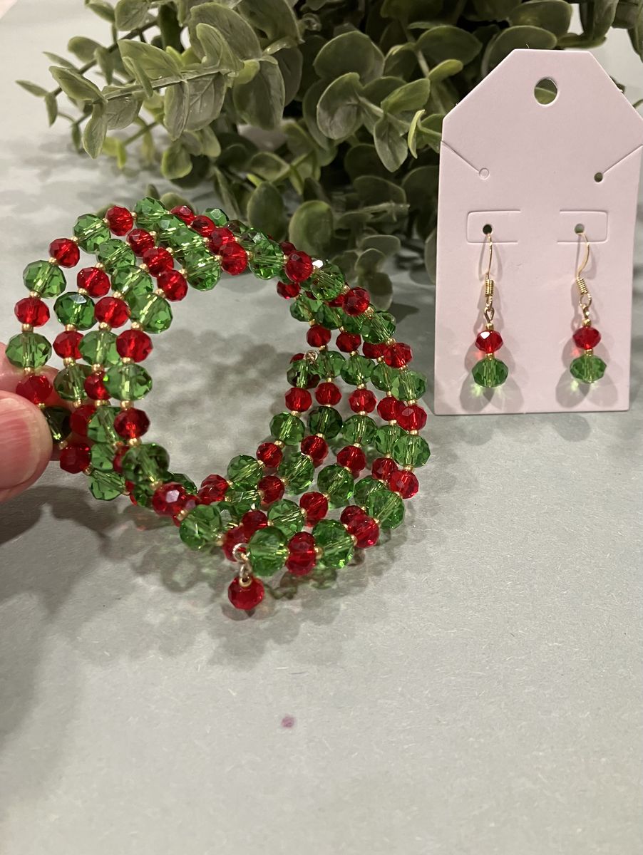 Vibrant red, green and gold Czech Crystal, multiple coil charm bracelet and dainty matching drop style earrings. Bracelet fits up to a size 6.5 inch wrist. Ear wires are gold plated. Gift box included. Local meetup or can mail with ship fee.