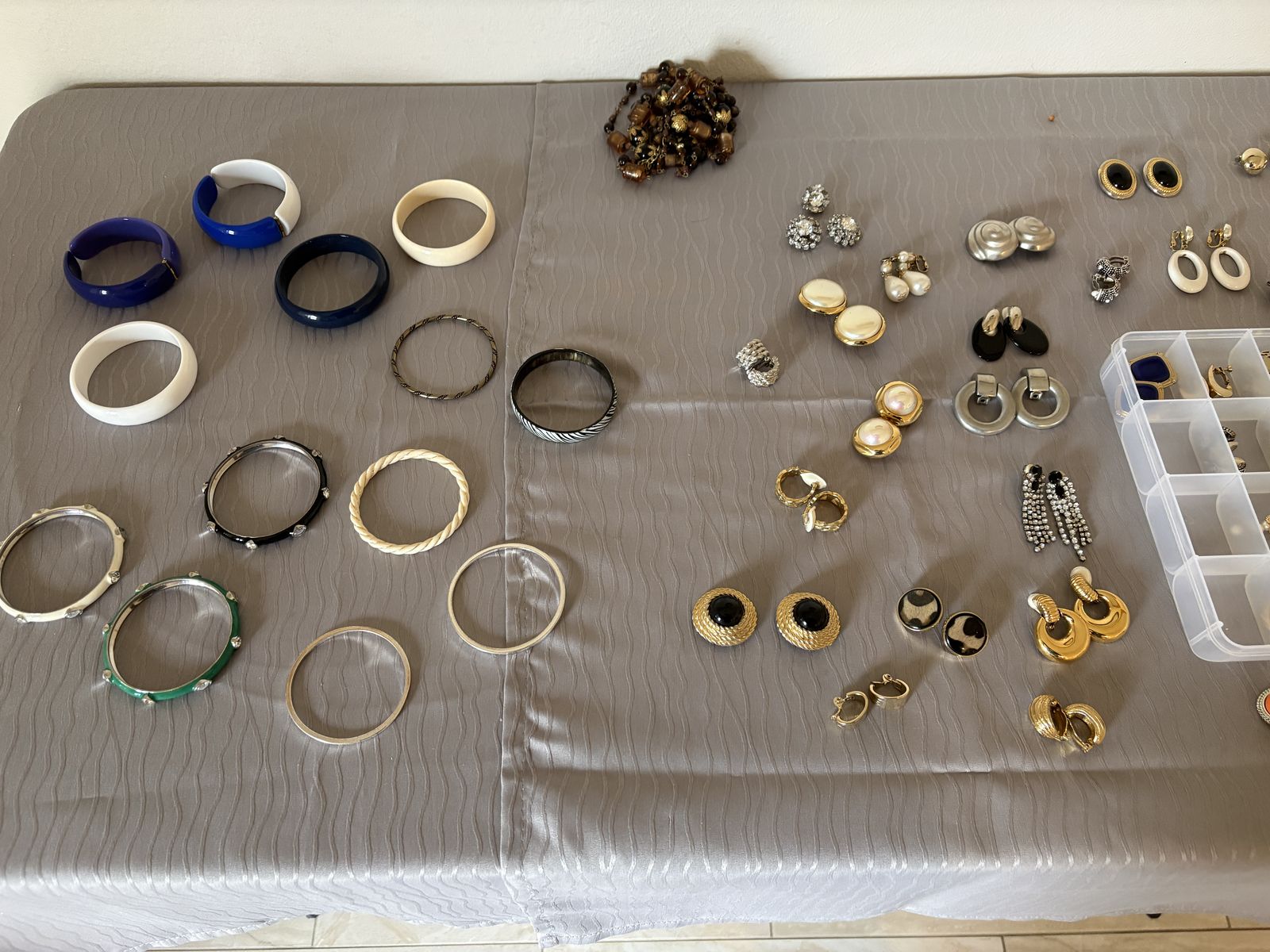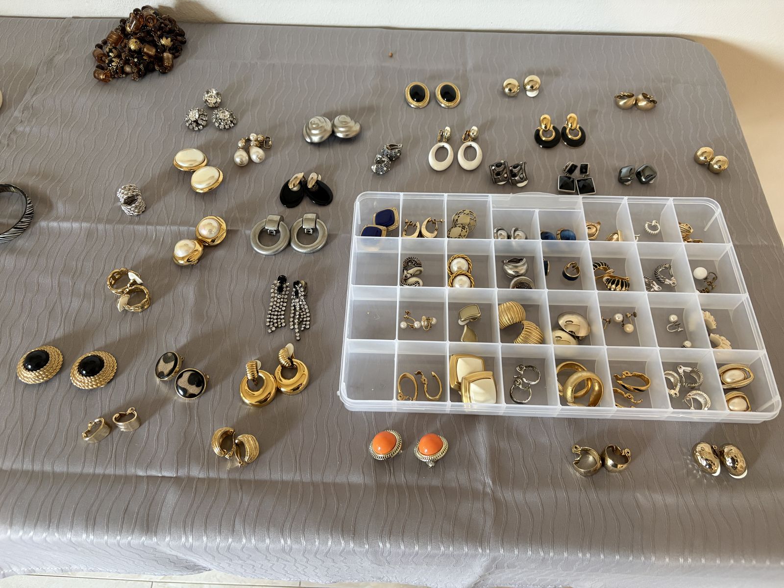 Wide variety of costume jewelry and cliip-on earrings, many are vintage; includes necklaces, bracelets, and clip-on earrings; many items are from Chicos; prices range from $2 to $10