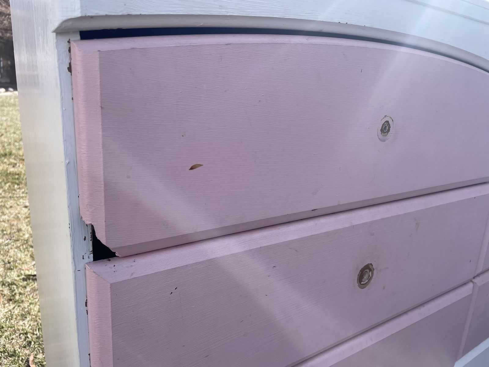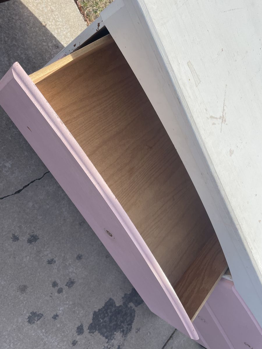 ZelleThis is a cute wooden dresser with 6 drawers. It needs some TLC, but is in overall good shape. The drawers and sides are solid wood. Would be great if stained or repainted.