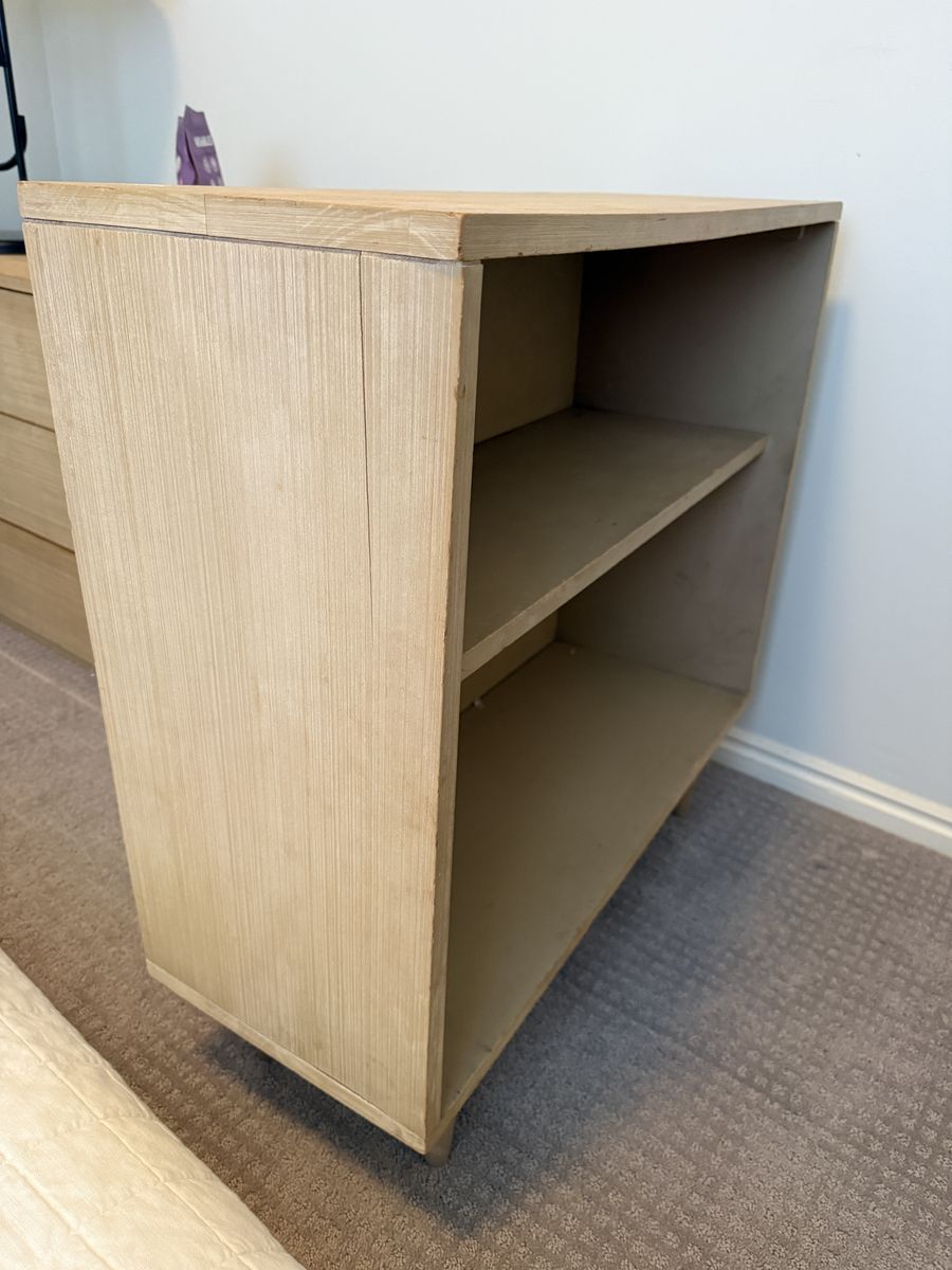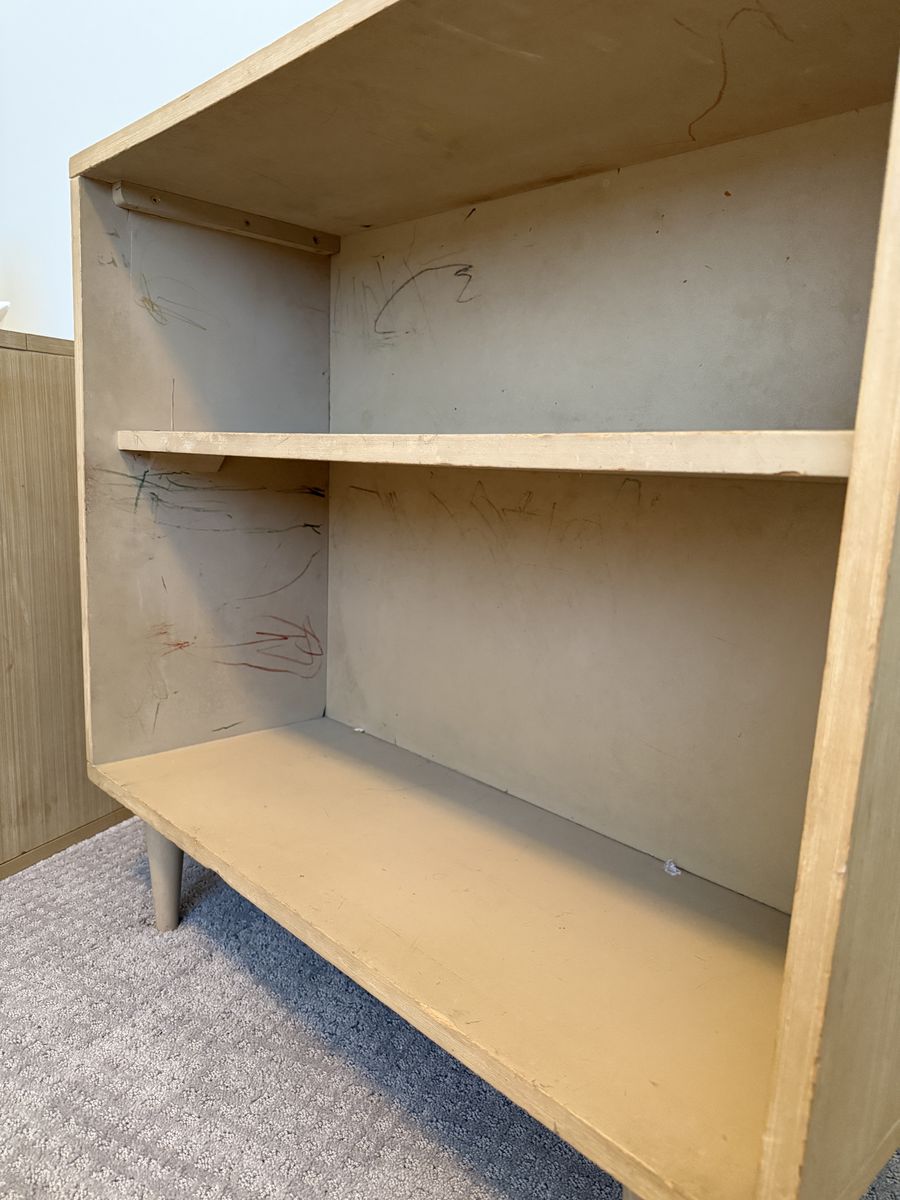 VenmoThis darling bookshelf needs some tlc, but has great mid-century modern lines. Blonde wood and tapered legs. The top shelf isn’t as deep as the bottom shelf. Condition reflected in price. 30 wide 11.5 Deep 10 deep top shelf 29.5 Tall Pick up in Herriman from pet and smoke free home. Bring help to move up a flight of stairs. Cash or Venmo. $40 Listed for a client