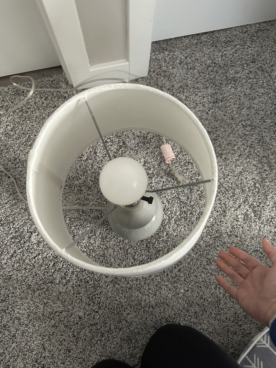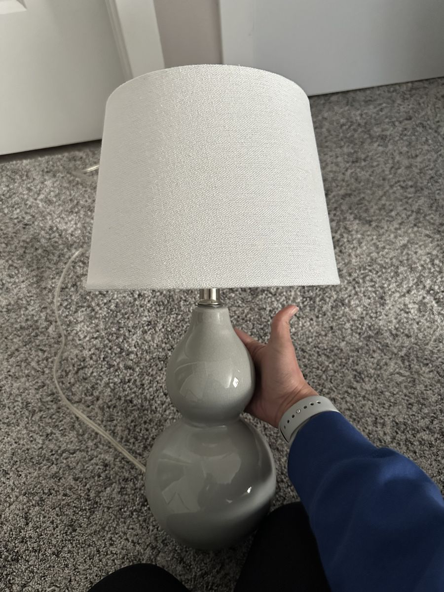 ApplePayGrey lamp with white lamp shade, slight shimmer on the shade. Used in a nursery. Fully functioning, like new