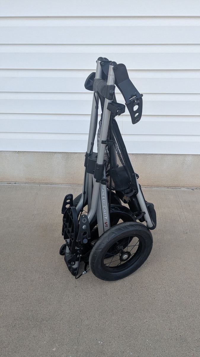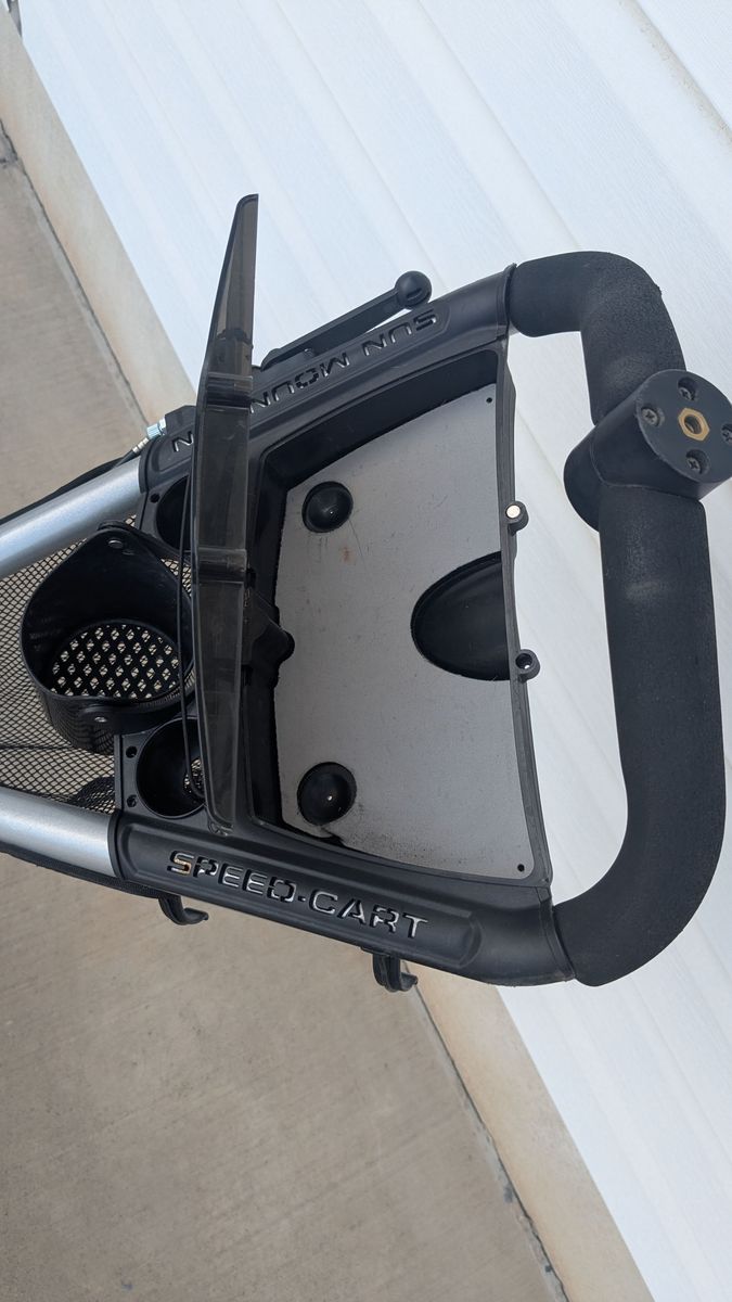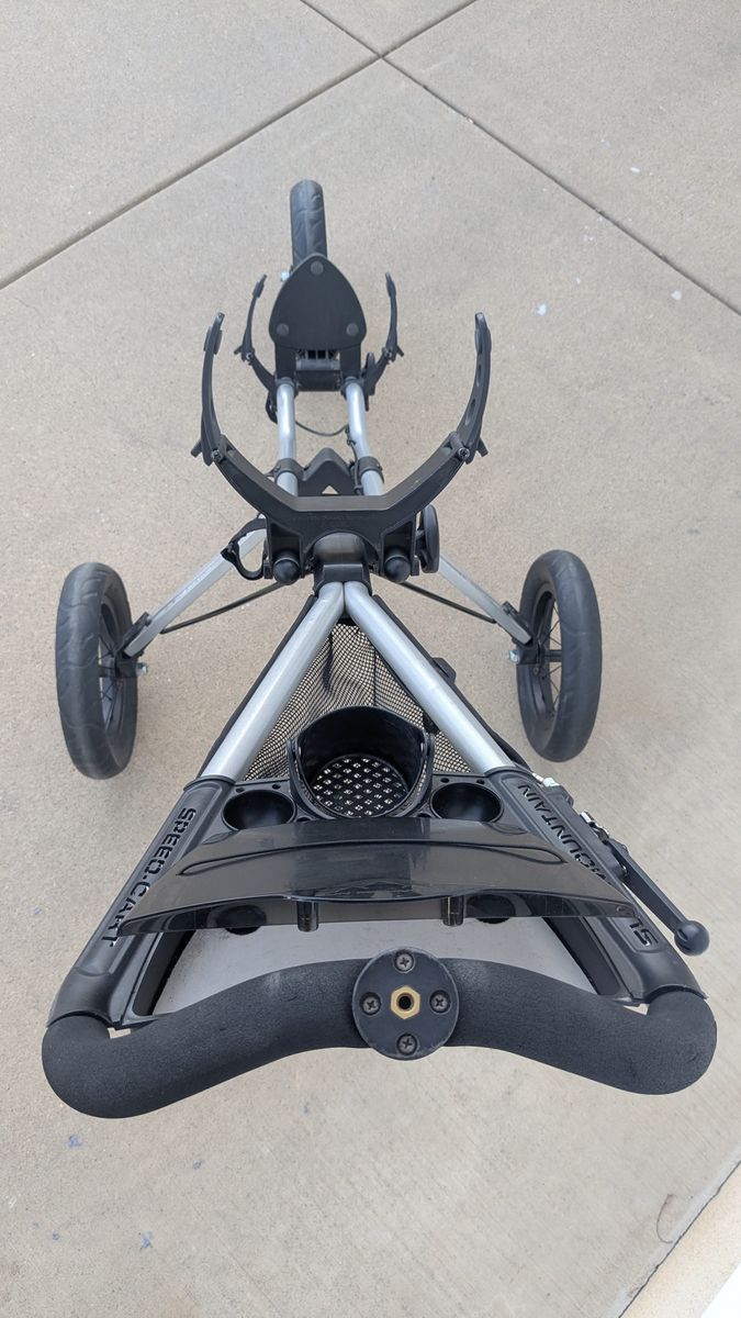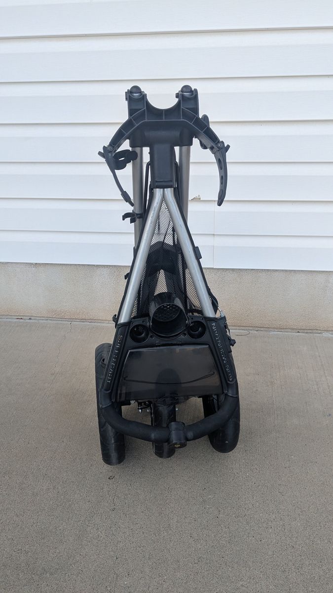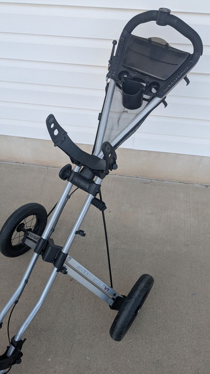 Sun Mountain V1 Speed Cart Silver and Black. Collapsible/Foldable Push Cart. Includes a hand brake for the front wheel. Wheels are rubber and in good condition.