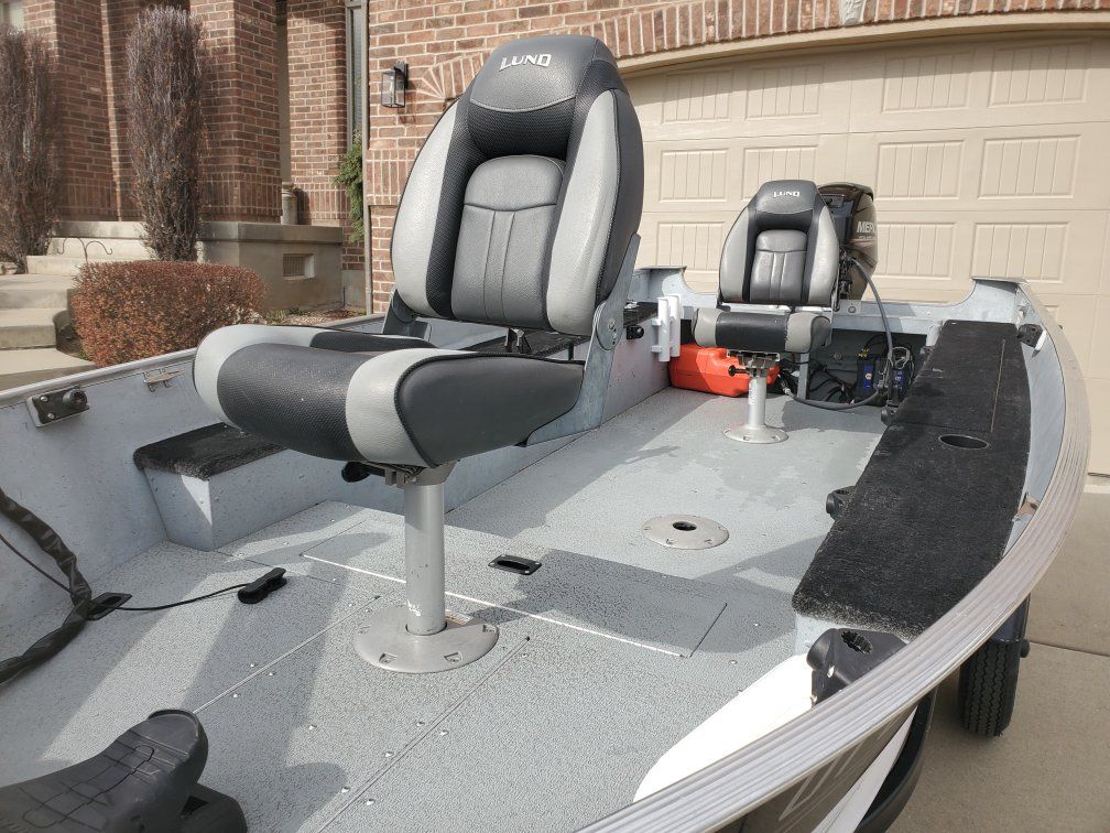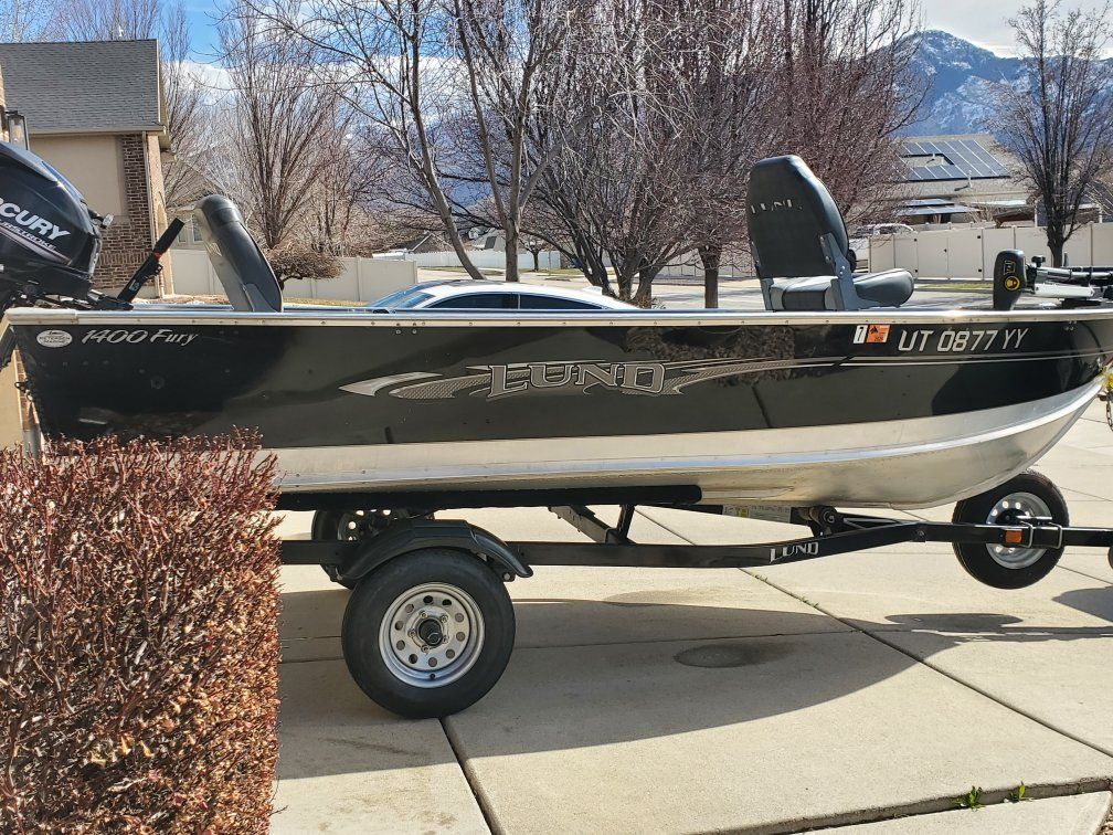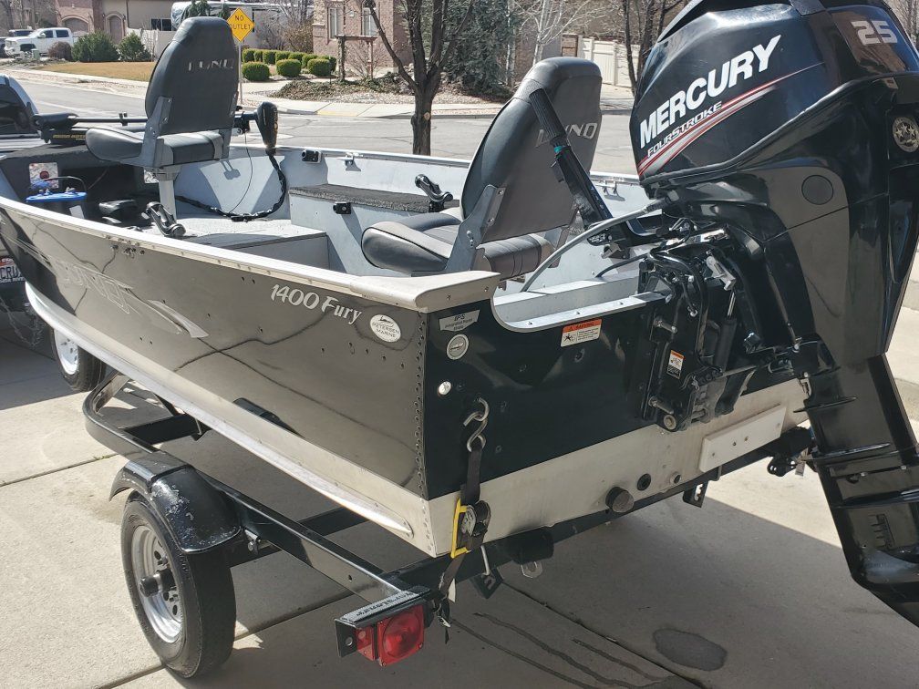 2016 Lund Fury 1400 fishing boat powered with a Mercury 25 hp 4 stroke with electric start and power tilt/trim. Has a 45 lb thrust Minn Kota edge on the front, live well, bildge pump, wired for bow and stern light, 2 pedestal seats, new boat cover, and a spare tire. Flat vinyl floor makes it very stable on the water. Also has ample storage. Boat is great shape. Rated for 4 people. Titles in hand. No trades.