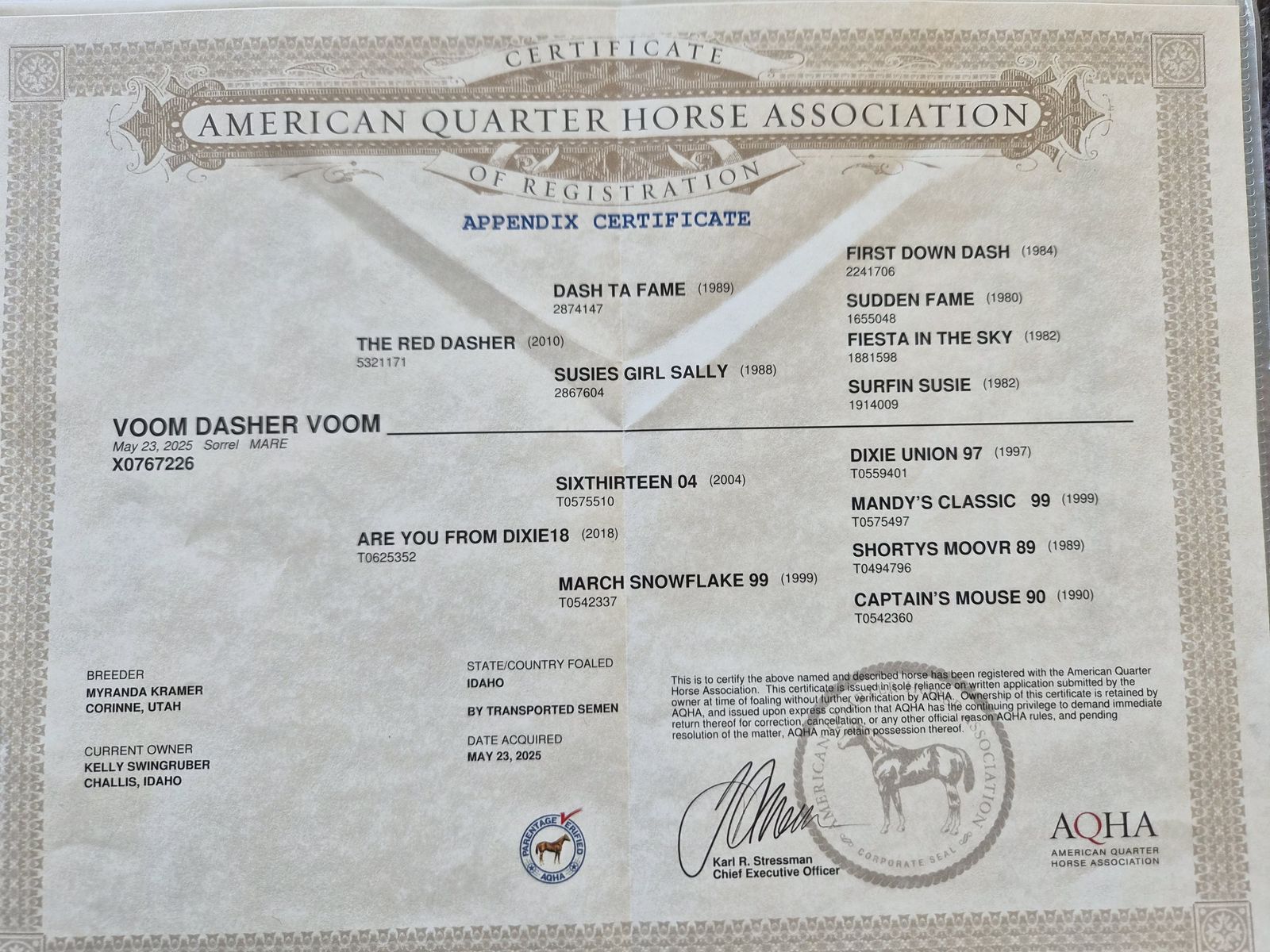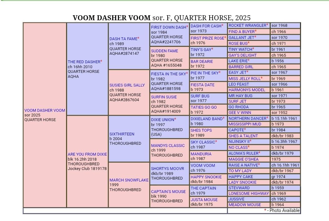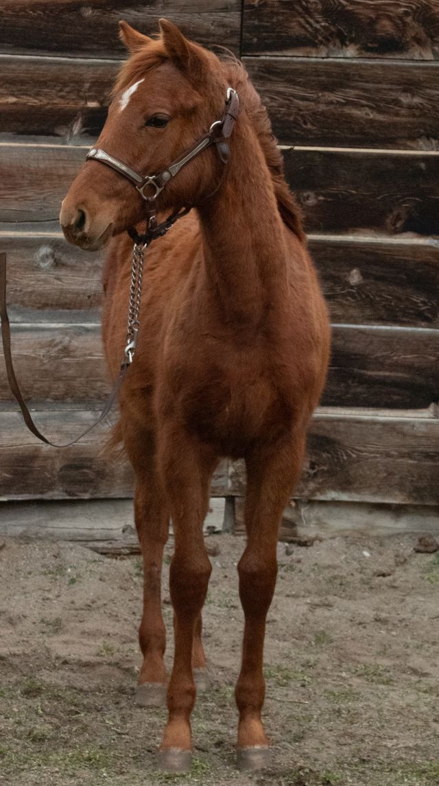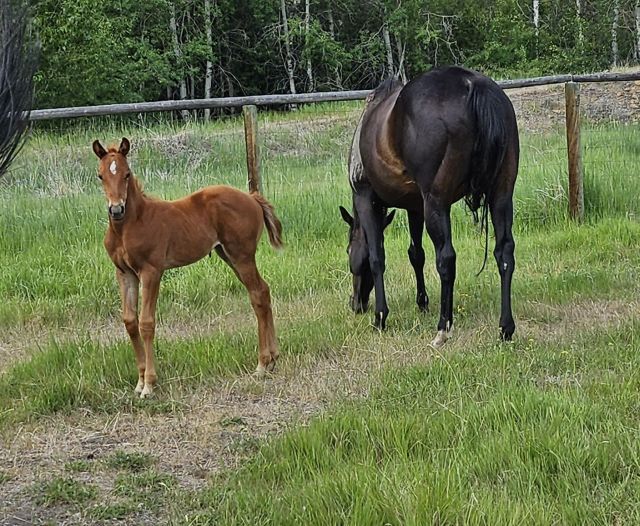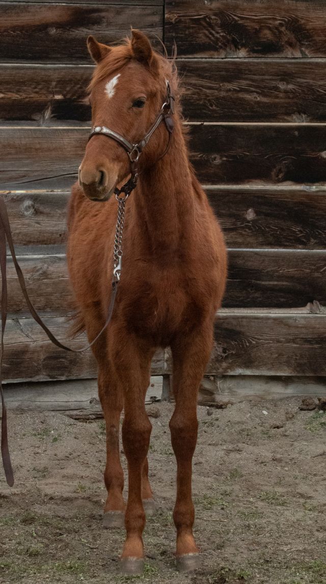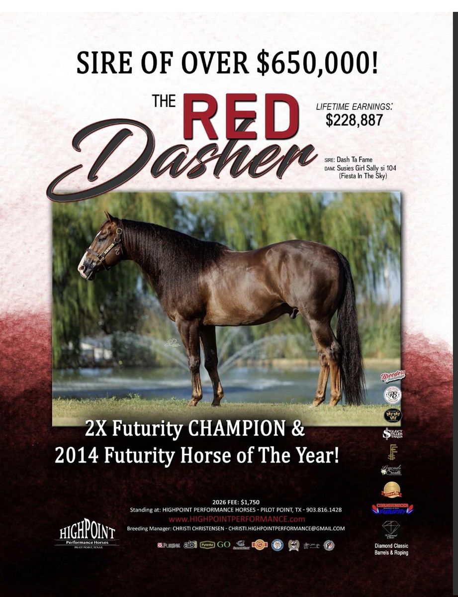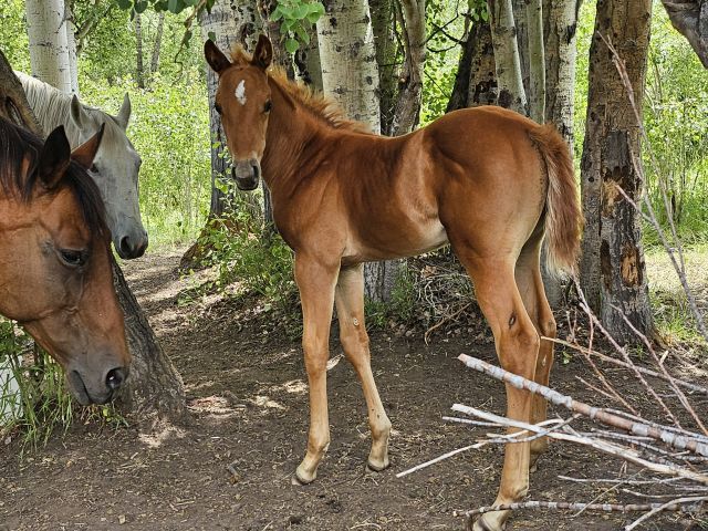 2025 AQHA filly by THE RED DASHER. The Red Dasher is by the great DASH TA FAME and has lifetime earnings of $228, 887 with offspring earnings of $485,000! This filly is out of a quarter horse type mare and has great conformation. Our mares run out, so the foals are born out, jump up and run outside from day one beside thier Mommas. She has correct conformation with good feet, bone and mind. She is halter broke, has had her feet trimmed and is UTD on vaccinations and worming. She will make an outstanding performance prospect with the great bloodlines she carries including Dash Ta Fame, Tiny Watch, Pie In The Sky, Easy Jet, Northern Dancer and Raise a Native. Possible delivery or partial delivery available.
