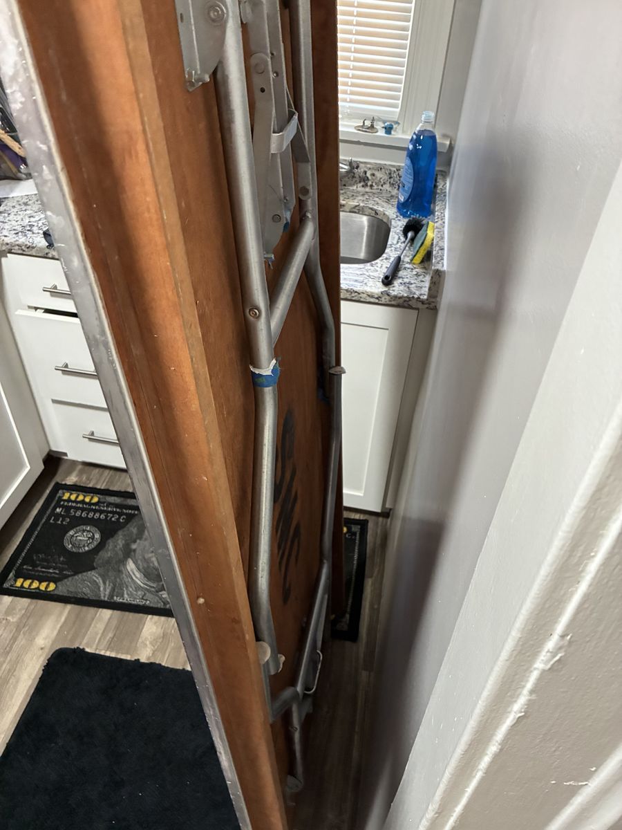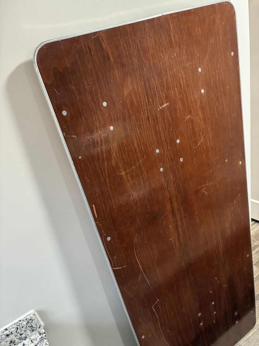 It’s a wood and metal fold-out table that isn’t trying to be fancy — it’s just here to be useful.