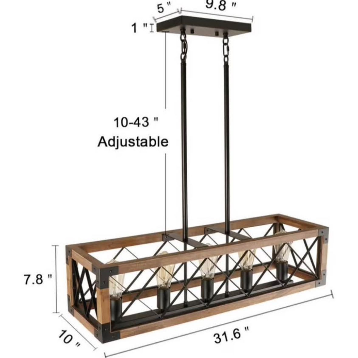 Rustic Wood Chandeliers:Canopy 9.8L*4.75H . Lamp Body: 31.6(L) * 10(W)*7.8(H), Metal Rod Length: Max 40-Min 9.8 Farmhouse Hanging Pendant Light: This elegant and unique light fixture is perfect for kitchen island,dining room, hallway,foyer, bedroom, living room, loft, entryway, cafe, bar, restaurant and any indoors. BULB REQUIREMENTS: 3 x E26 60W bulbs (Not Included),compatible with many kind bulbs like Dimmable Blubs, Energy saving bulbs, Led Bulbs, Edison Bulbs etc. And compatible dimmer switch (Not Included). Hard Wired. Voltage: 110-220V.