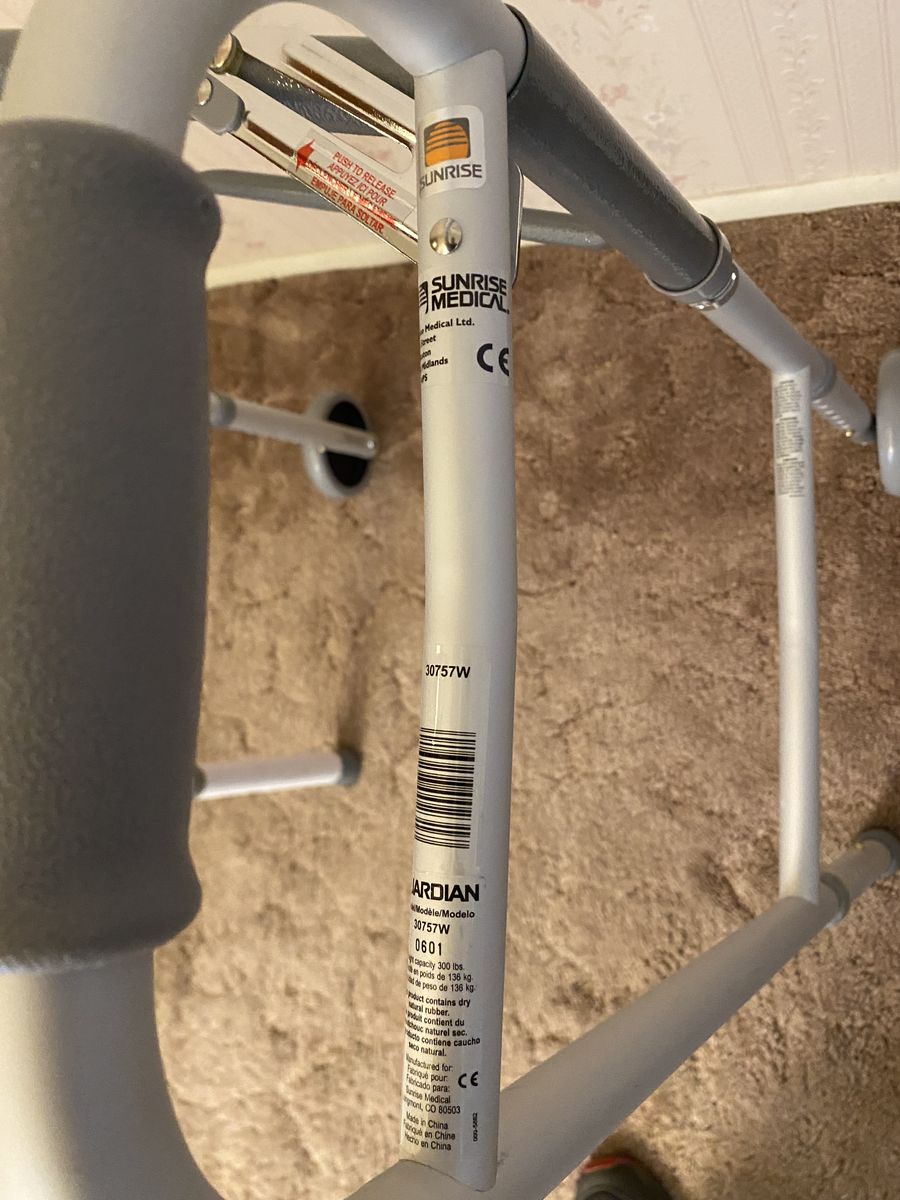 Guardian walker in like new condition. Height is adjustable, and one leg still has the cardboard wrapping on it. Front does have wheels. FCFS. Cash only. Thanks for looking!