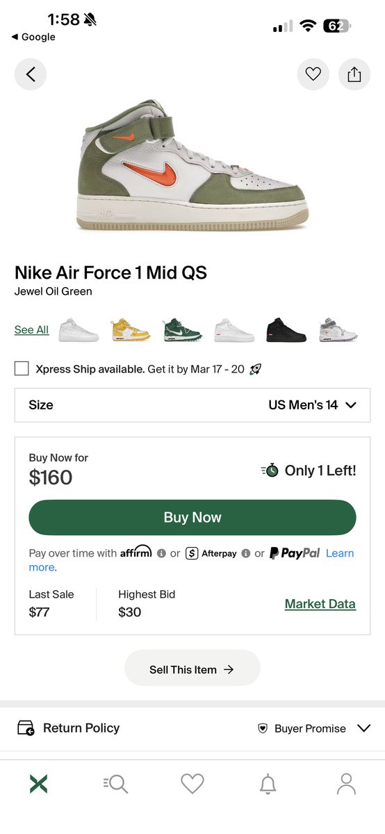 VenmoNike Air Force 1 mid QS jewel olive green in size 15 almost new condition.