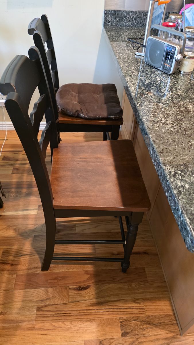 Zelle54" X 54" TABLE WITH 6 INDIVIDUAL CHAIRS & ONE BENCH CHAIR (SEATS 2). TABLE HAS DRAWERS TOO! 3 BAR HEIGHT CHAIRS (2 SHOWN IN PIC).
