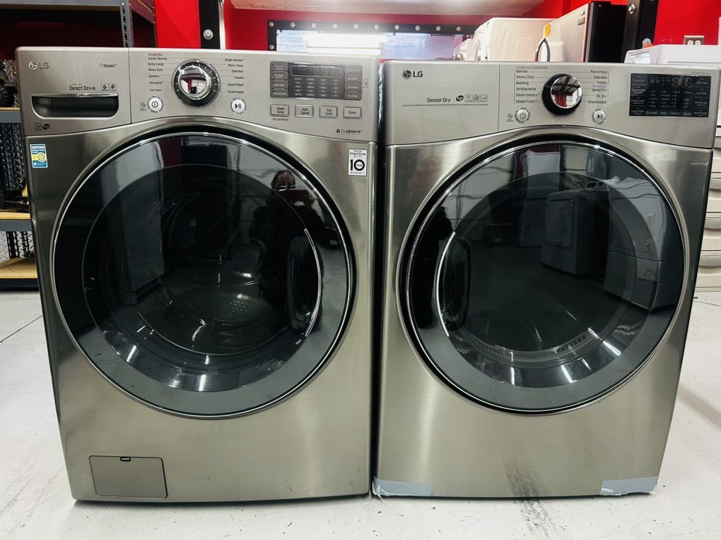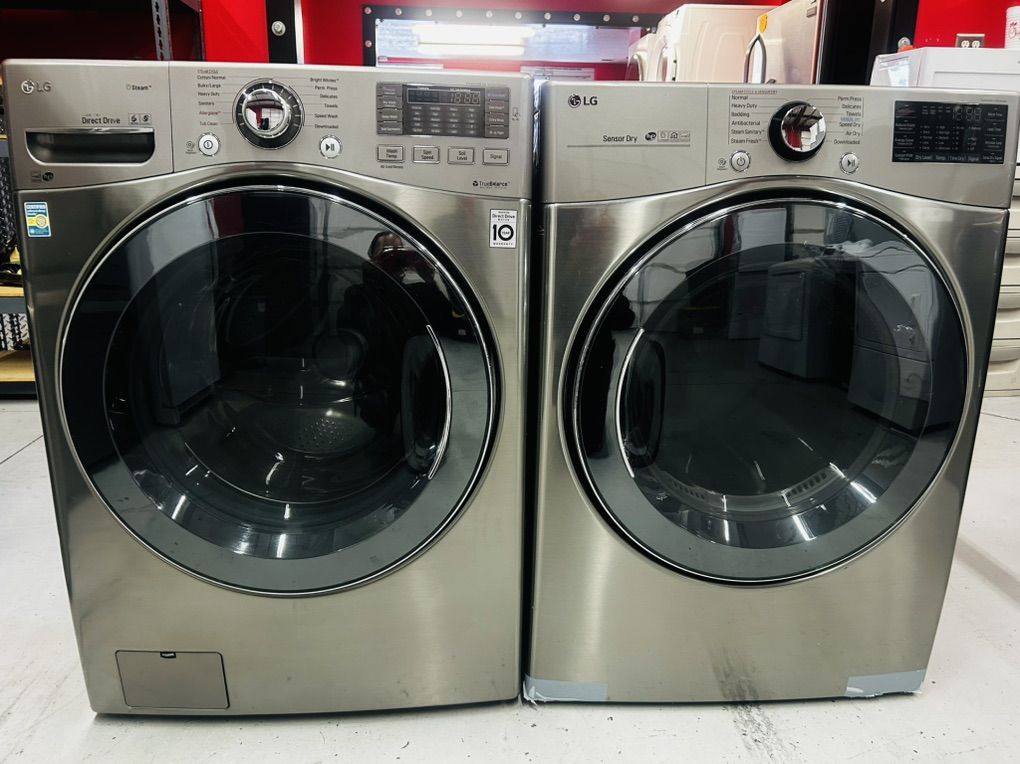 Lg Steam washer true balance anti vibration system stainless steel drum heavy duty tub clean bulky large allergiene steam fresh cotton normal hand wash speed wash prewash rinse plus spin extra rinse water plus delay wash etc..Lg Steam Gas Dryer sensor dry stainless steel drum heavy duty cotton normal steam fresh speed dry air dry anti bacterial wrinkle care time dry etc..Can be stacked. Work great, no issues. Clean. 45 day warranty. Delivery available.