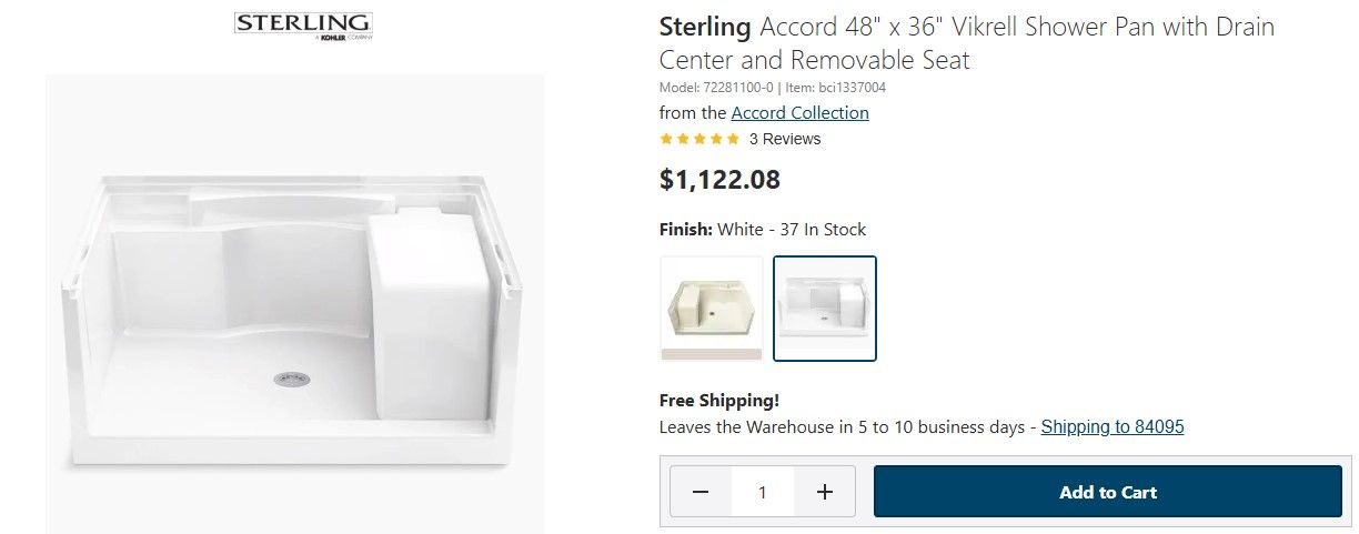 ApplePaySterling Accord 48" x 36" Vikrell Shower Pan with Drain Center and Removable Seat