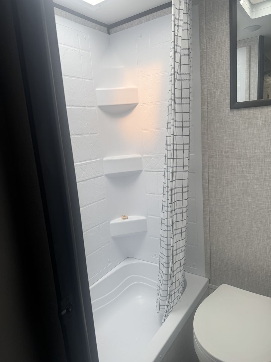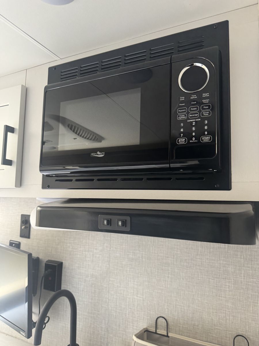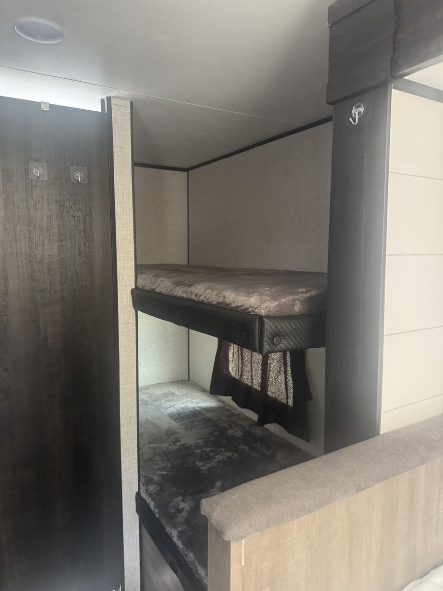 Also includes: Center living room, convertible table to bed, 2 burner stove, patio awning, booth dinette, microwave, oven, tv, front bed queen, rear bath/shower