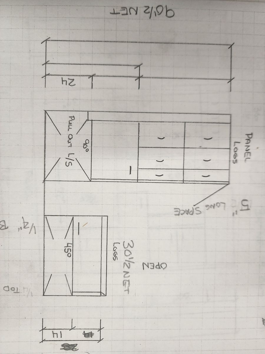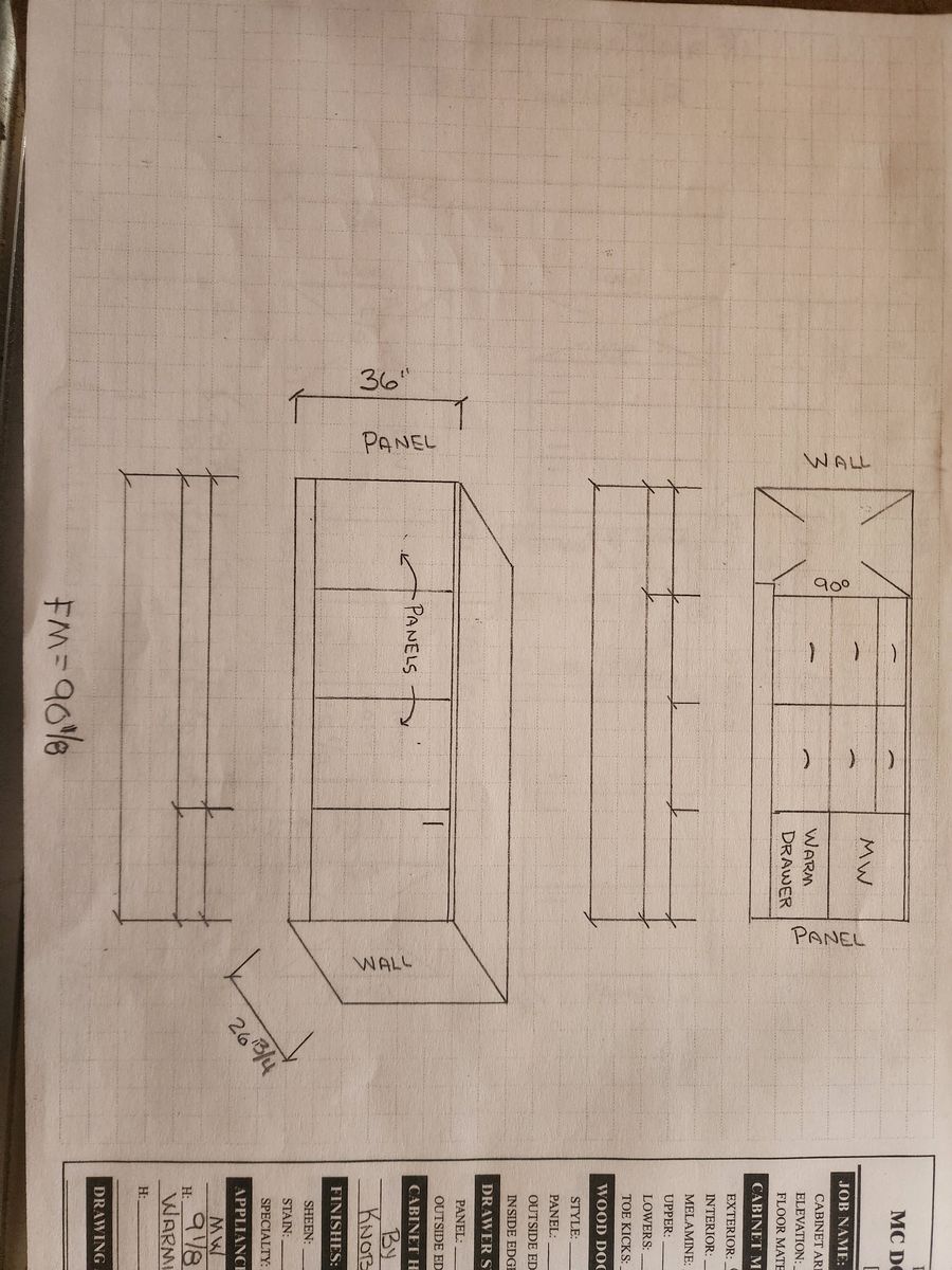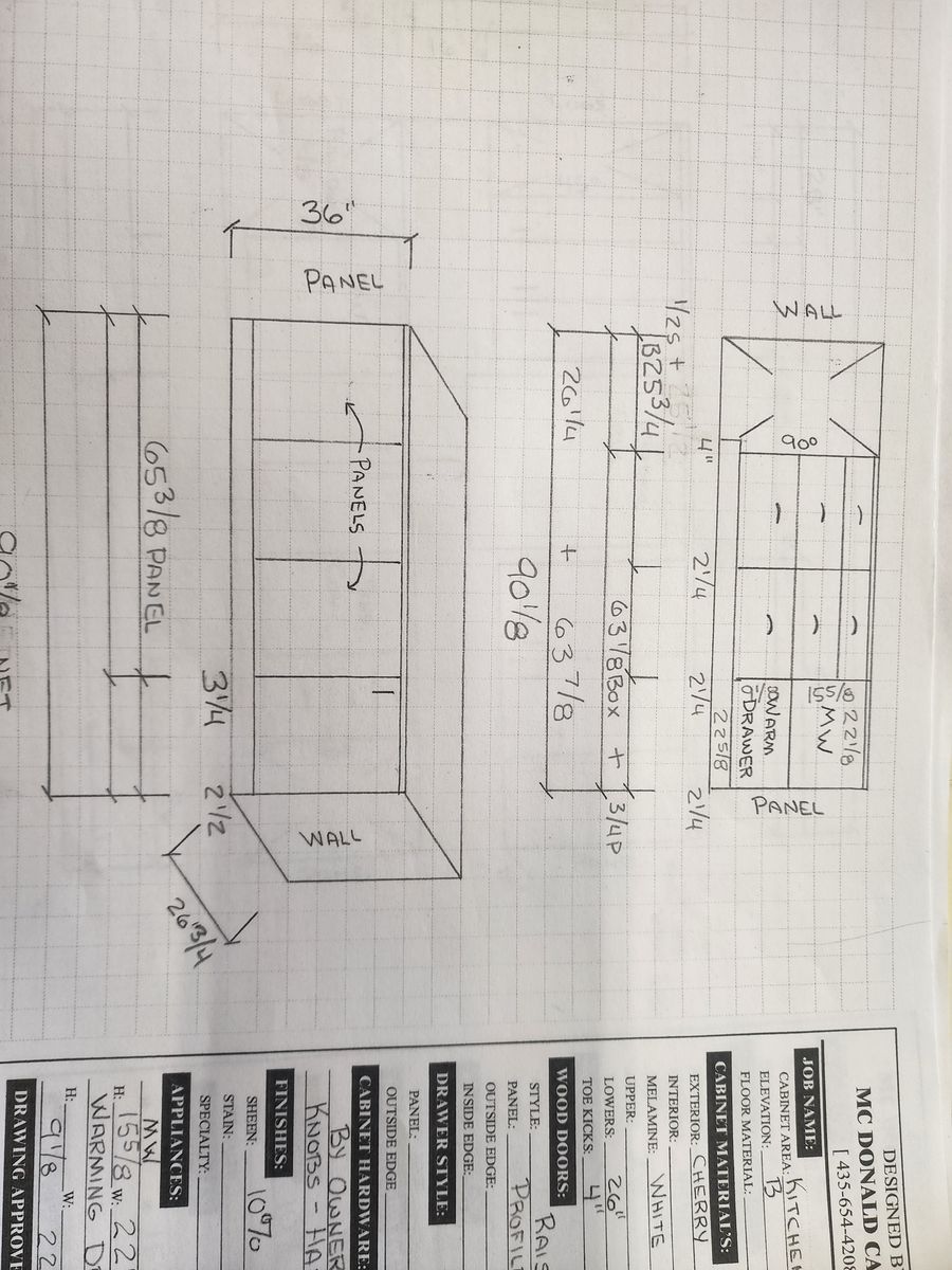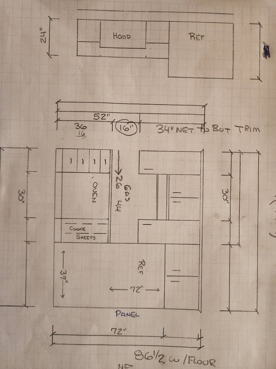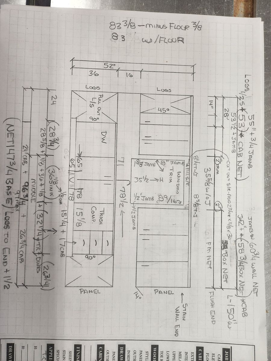 I have a full kitchen set of cabinets pulled from a remodel we're doing. The blueprints you see with dimensions are the same new ones going in to replace the ones we pulled out.
