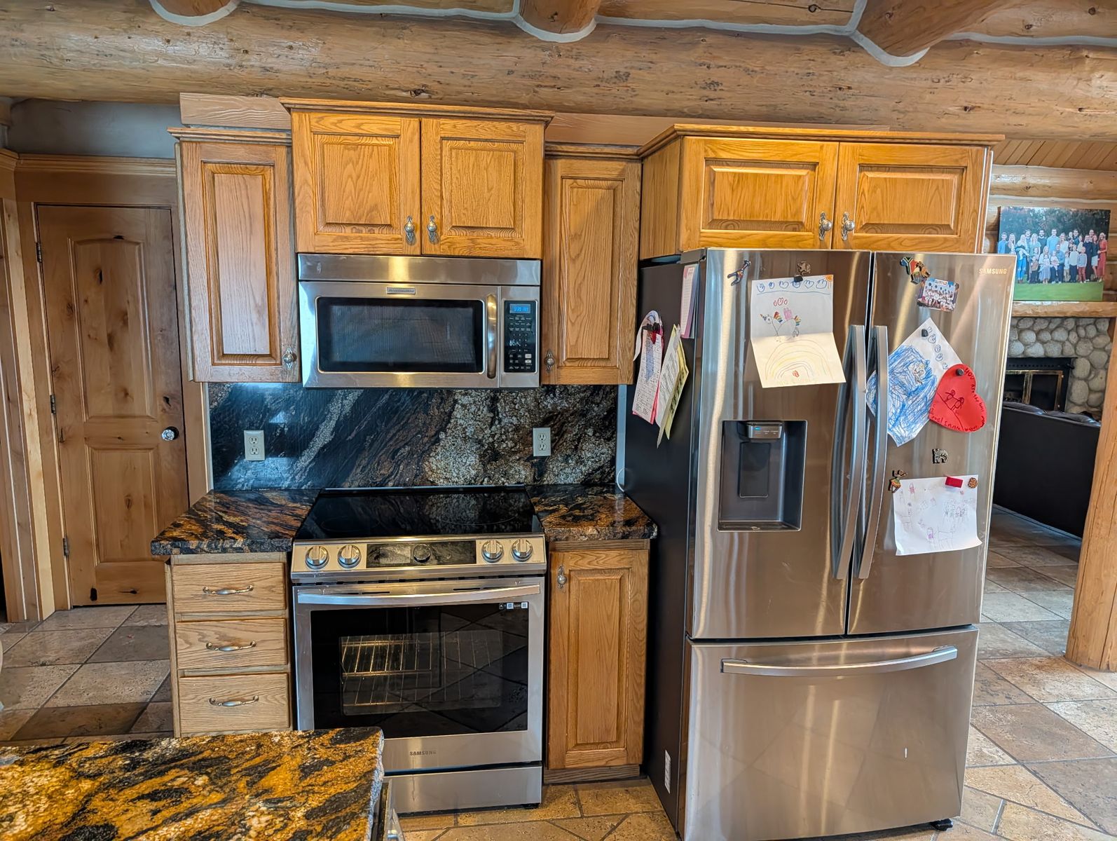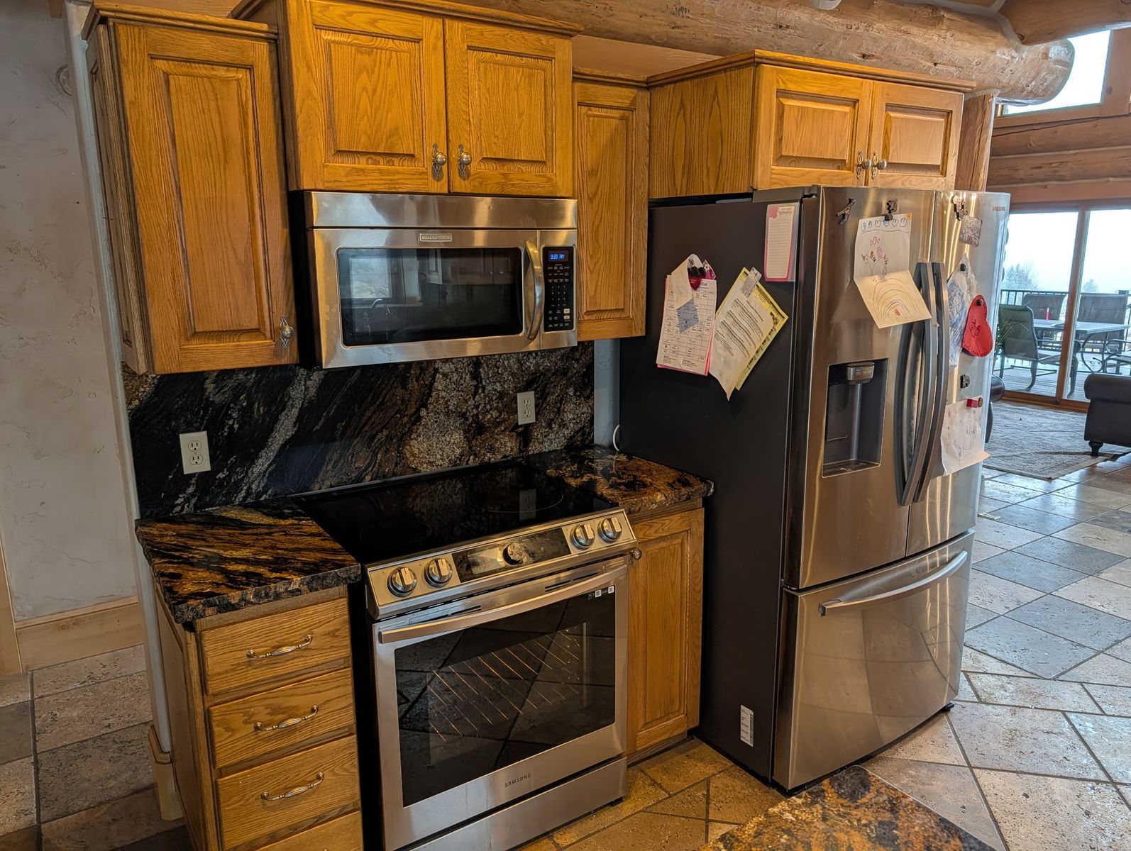 Full kitchen set which includes the big giant microwave that went above the Oven. So, minus sink, trash compactor, stove, fridge, oven warmer, and grabage disposal almost all was salvaged including the 2 large granit tops that went to the left and right of the sink. We couldn't save the granite back splashes. They were construction cemented it so hard we had to destroy them to get them out.