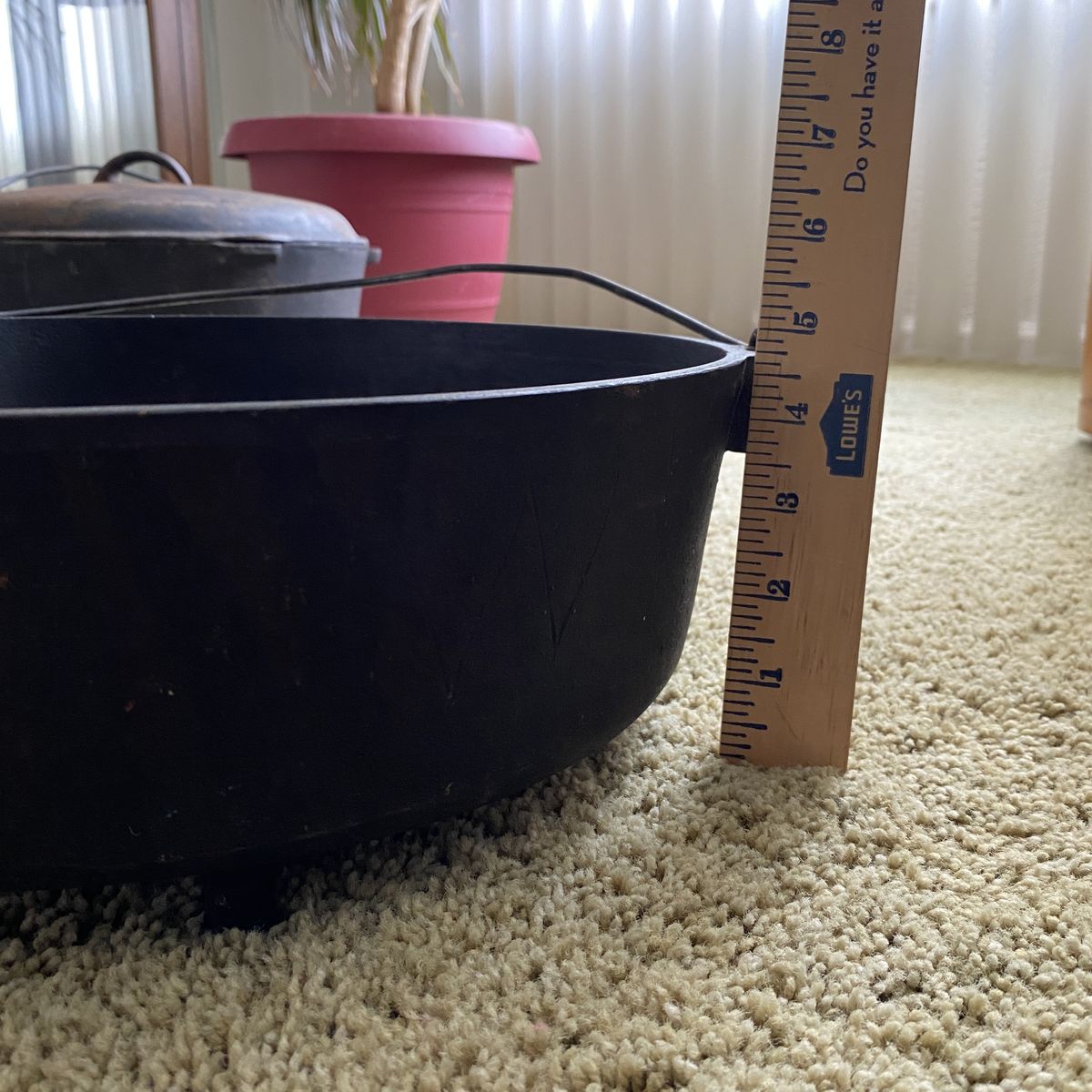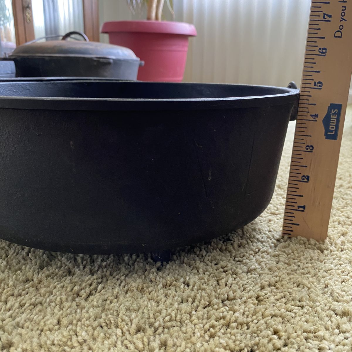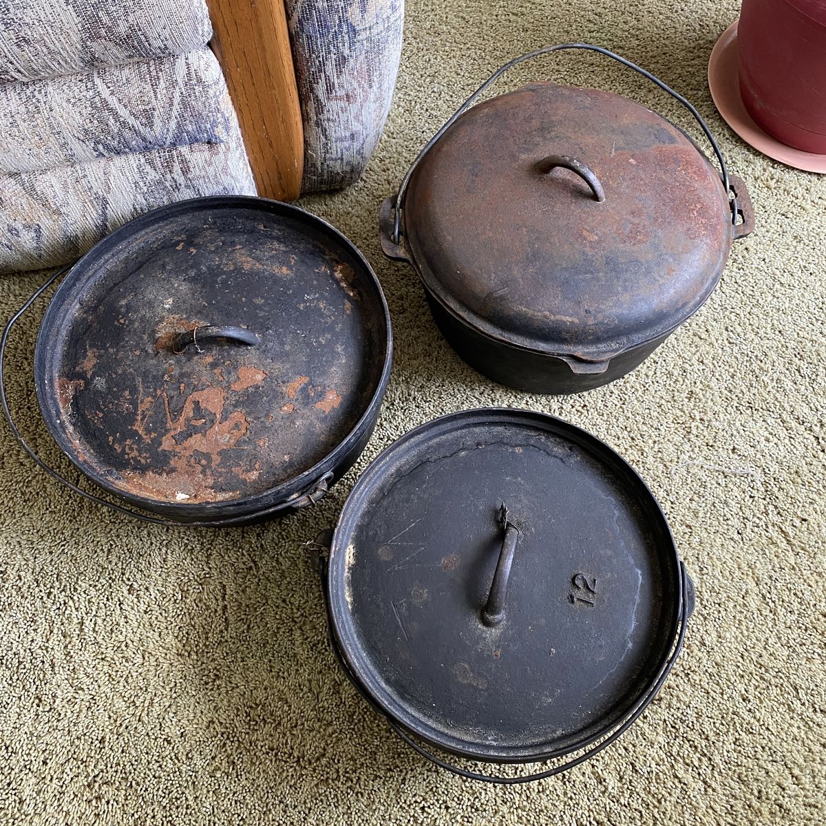 3 large dutch ovens. These belonged to my Grandpa and have been used a lot. Measurements are in photos. They are heavy.