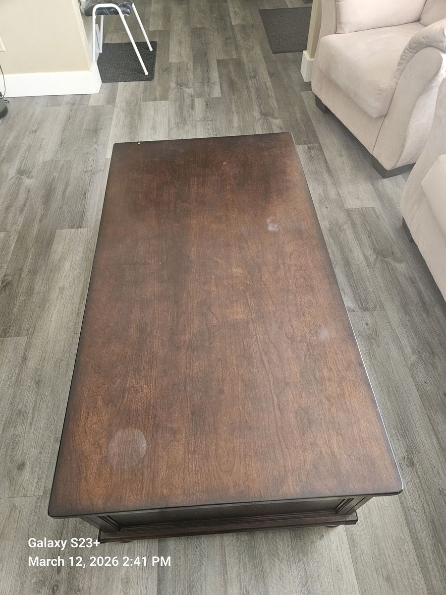 ZelleSolid Cherry Hard Wood Coffee Table 4.5' by 2.5' Six drawers, solid wood circular feet.