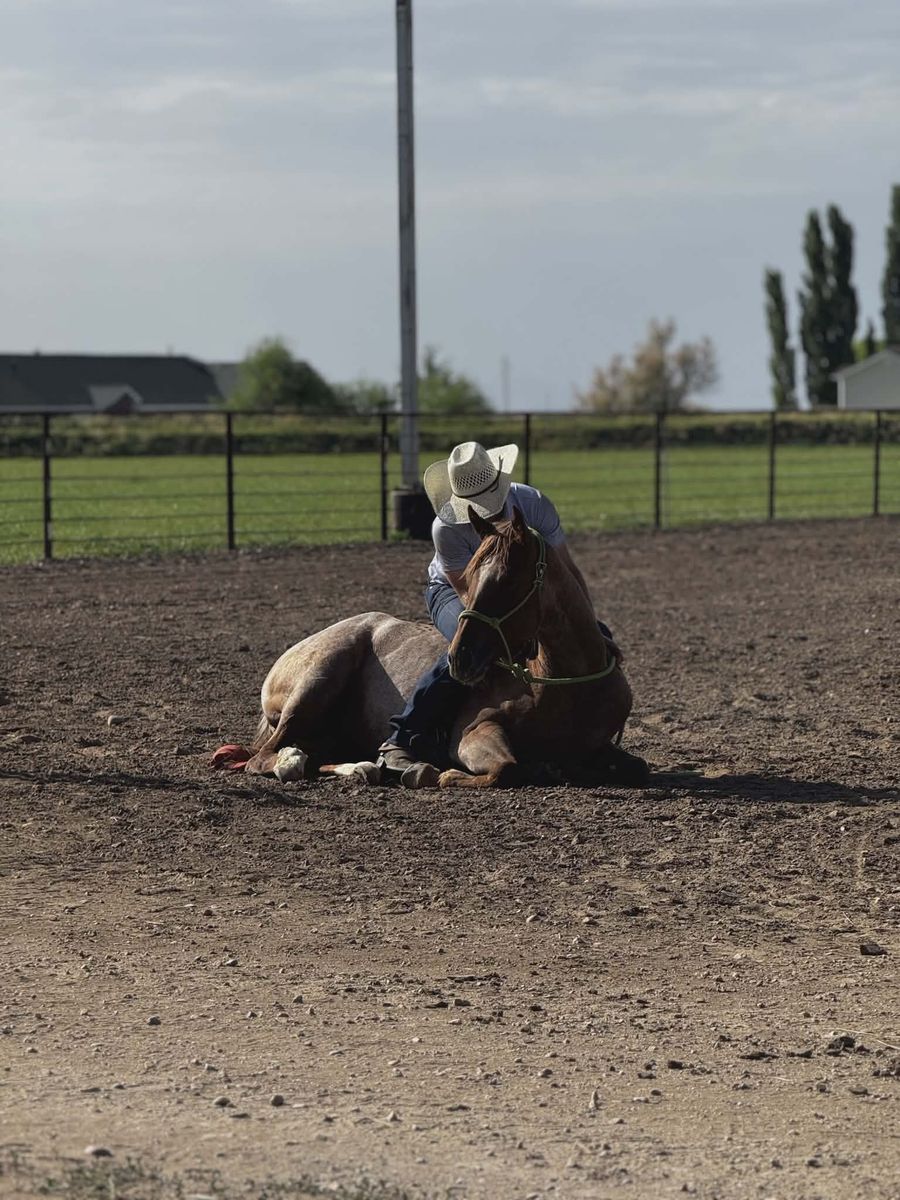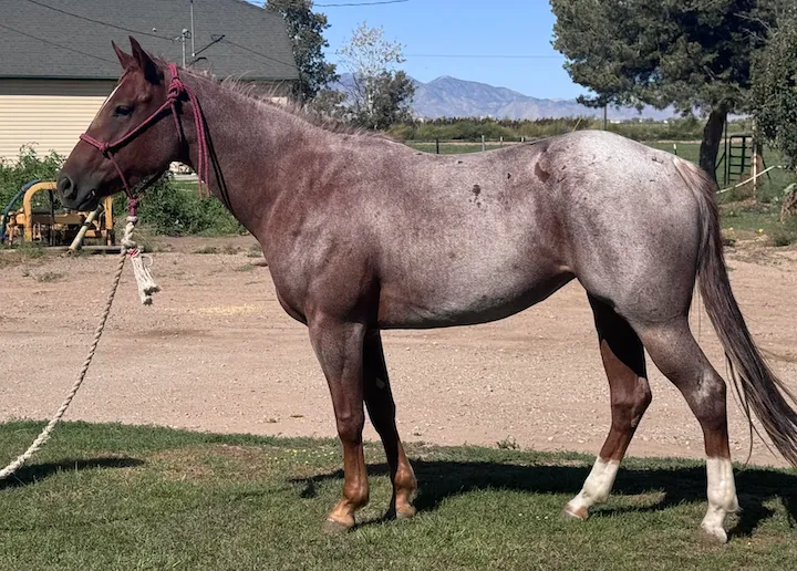 Mercedes is a red roan mare with lots of try. She is very athletic and has a very nice stop and always has a sunny disposition and is super Friendly, loves people, especially children. Her personality shines in all aspects, whether it be in the arena, branding pen, out in the pastor doctoring cattle or out on trail Rides Alone or with big groups. She will stand tied will not pull back and stays relaxed in rough situations. She is Hardy with good feet and great confirmation all around. She has no buck or runoff issues and to boot you can lay her down to get Yourself in the saddle.