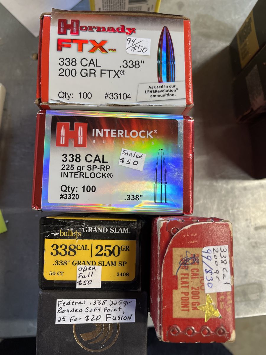 .338 cal bullets are all 10% off marked prices. Barnes, Federal, Hornady, Nosler Partition and Speer. Already marked down from Midwayusa prices. 200-250 gr 338 cal bullets. I will ship for postage costs. Please see my other ads. Thanks, Joe.