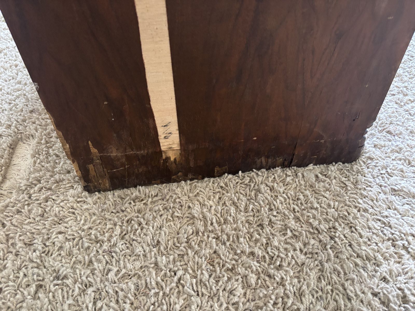 There is some previous water staining at the base (pictured) that you can see in the fourth picture. The wood remains structurally sound it just has the water stain appearance.