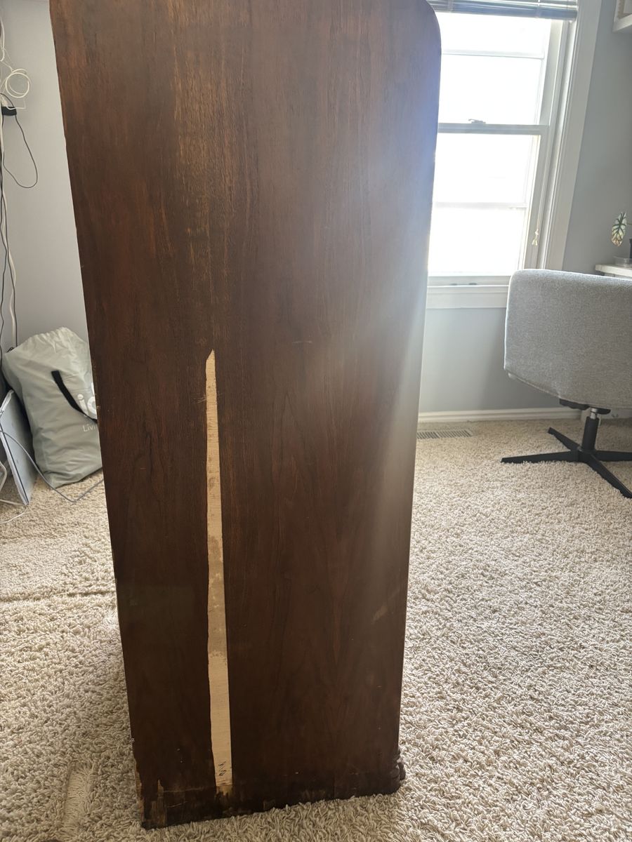 Bought in current condition (i.e. with wood strip missing as pictured). I still have the wooden strip that can be glued in that place.