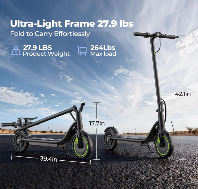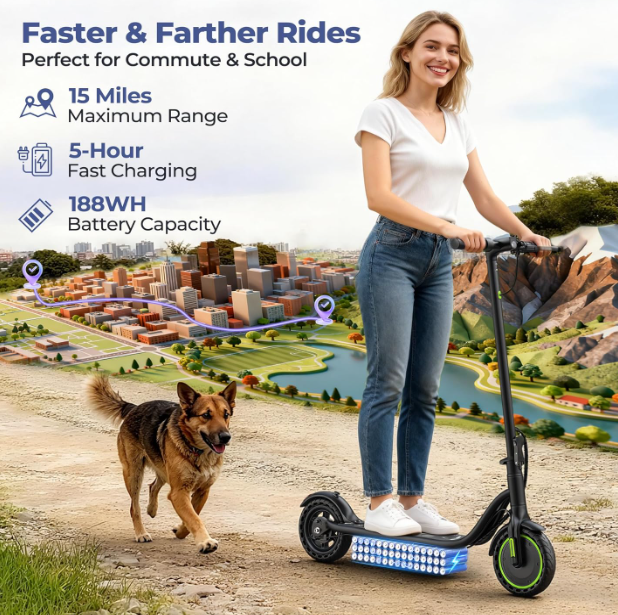 Long-Lasting Battery: Built with 36V 5.2Ah lithium battery(187.2Wh), the adult electric scooter charges fully in 5 hours and delivers up to 15 miles of range. Reliable battery performance eliminates range anxiety for everyday travel
