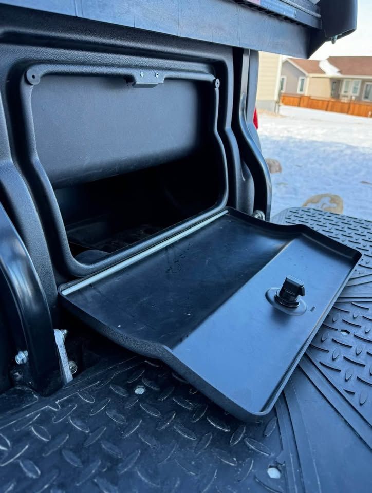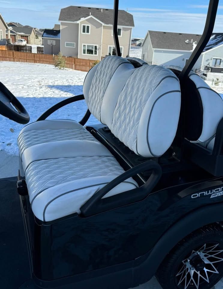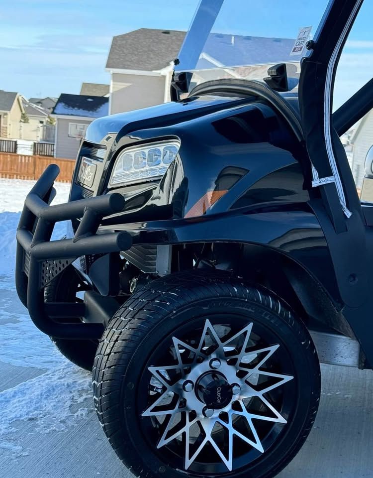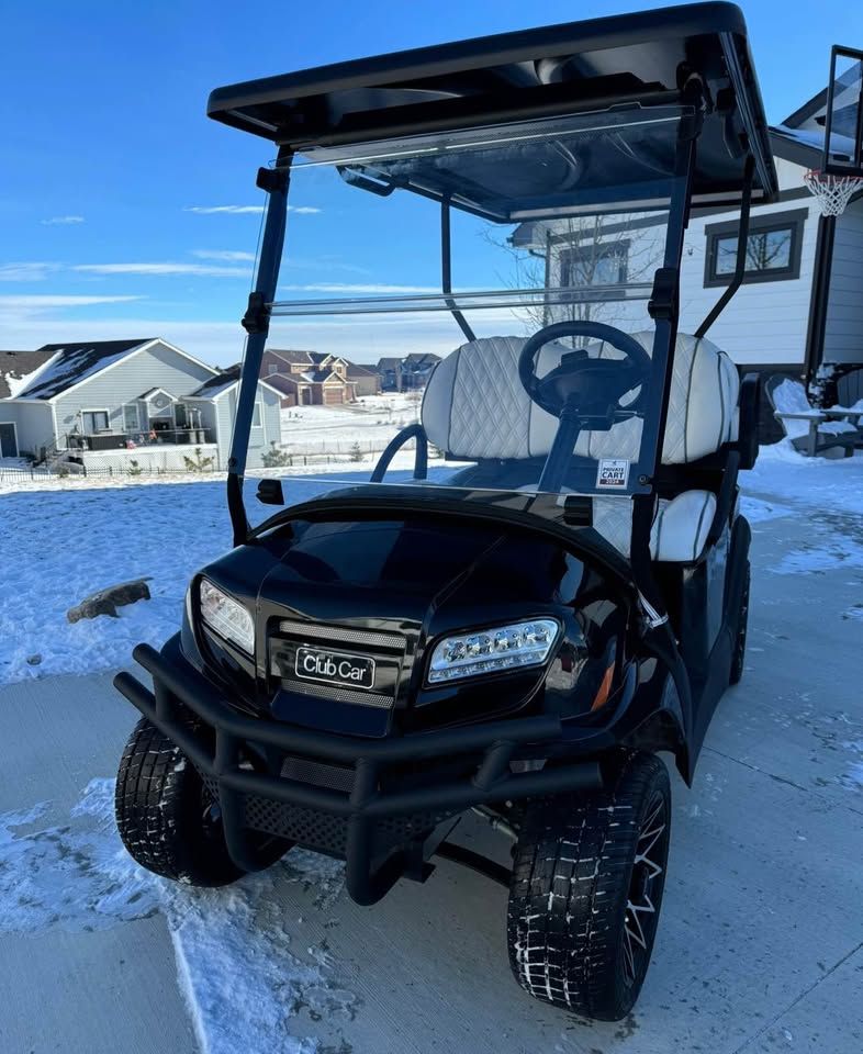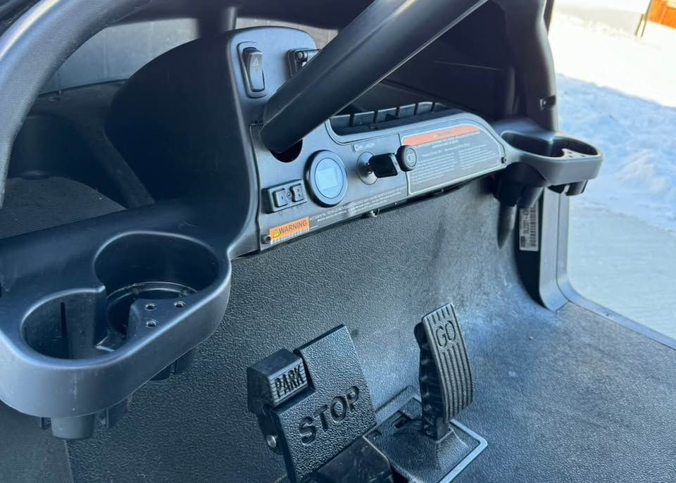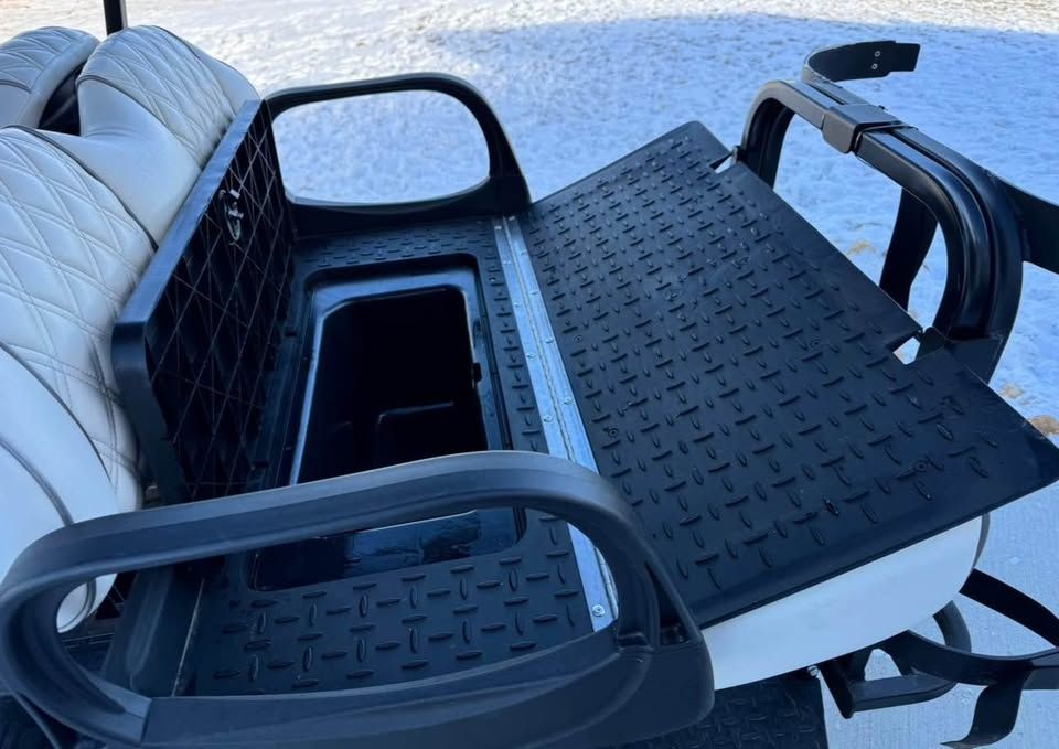 • 4 passenger • 12” Gloss Black Athena wheels with street/turf tires • Elite white & silver seats • Premium flip windshield • Brush guard & grill accents • Rear locking trunk • Under-seat cooler/storage • Comfort grip steering wheel • VersAttach system (bag holder + cooler/sand bottle holder) • Premium Bluetooth speaker/audio system • Deluxe winter enclosure/cover - included • Smart lithium battery charger (110V)