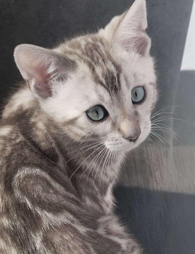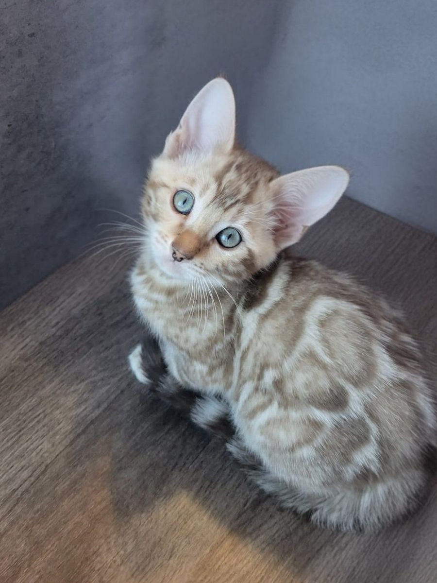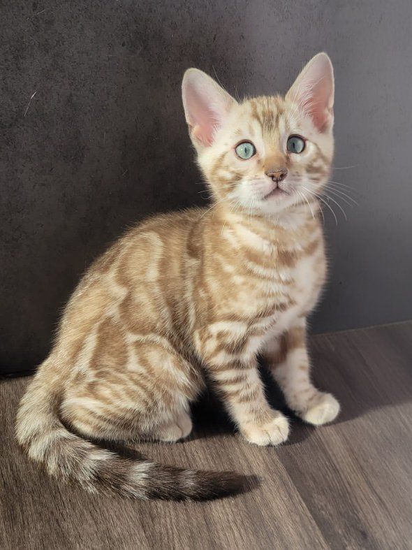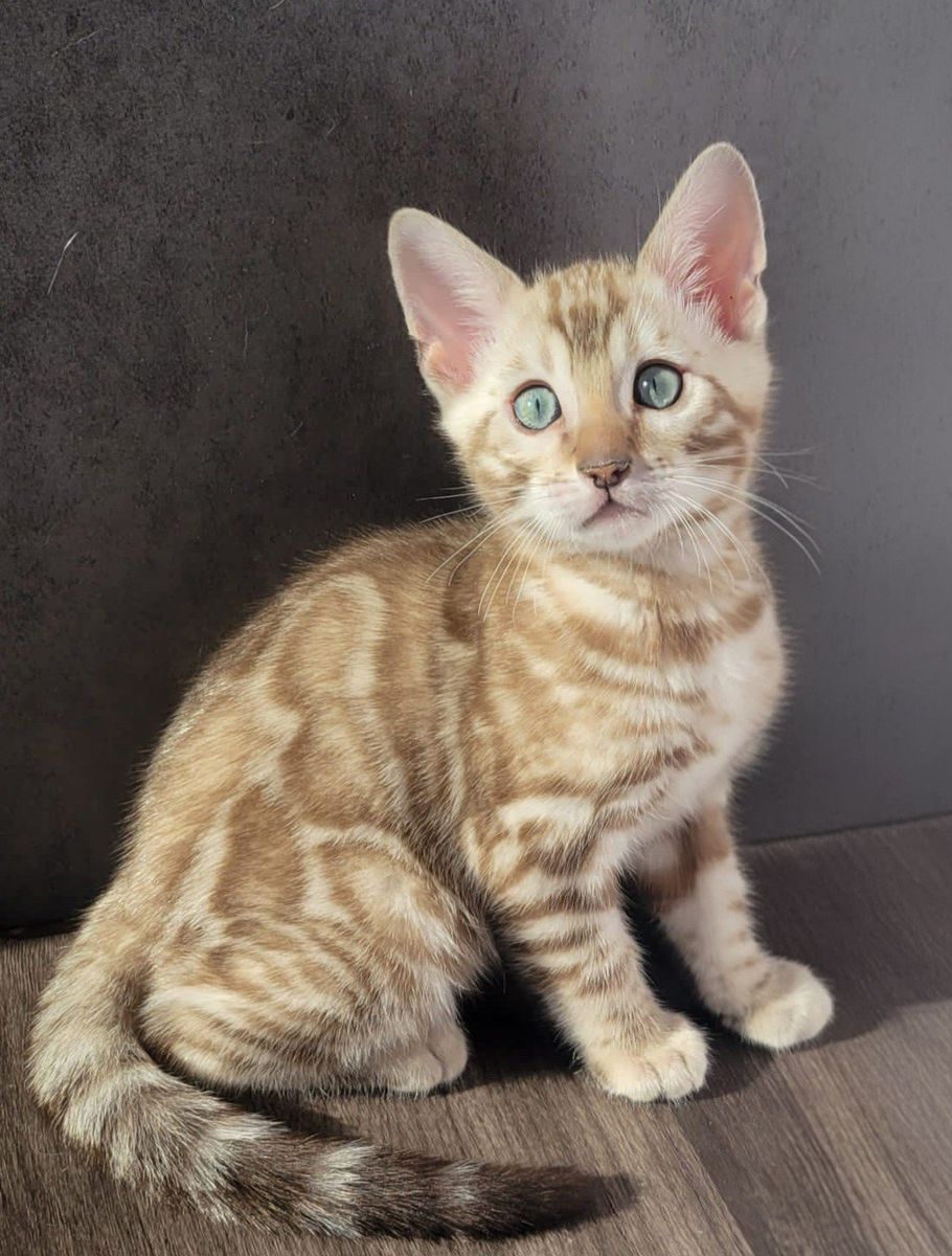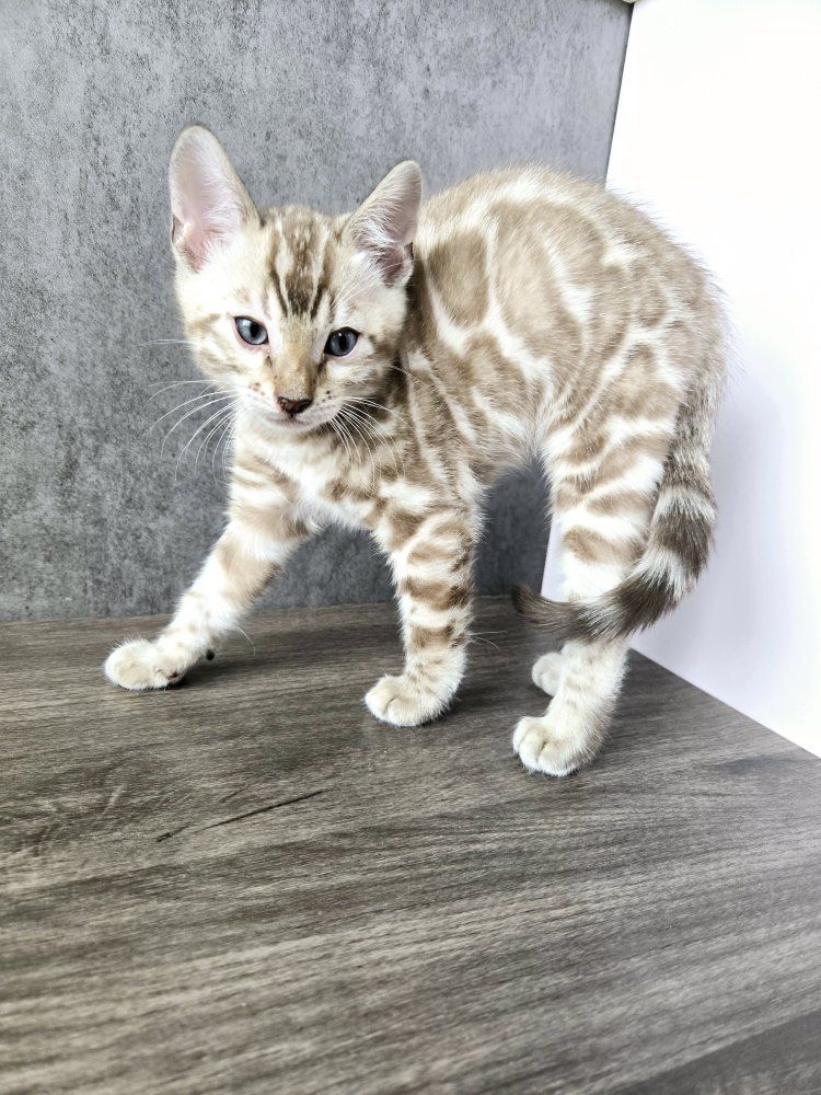 Our F7 Little Snow Mink Bengal kitten is almost ready to go home with you and bring joy, cuddles, and endless love into his new home! All our kittens are raised in a loving family environment, these kittens are well-socialized, playful, and incredibly affectionate. This little boy has been snuggled, held, and played with daily, making him incredibly friendly and people-loving Bengals you’ll find!