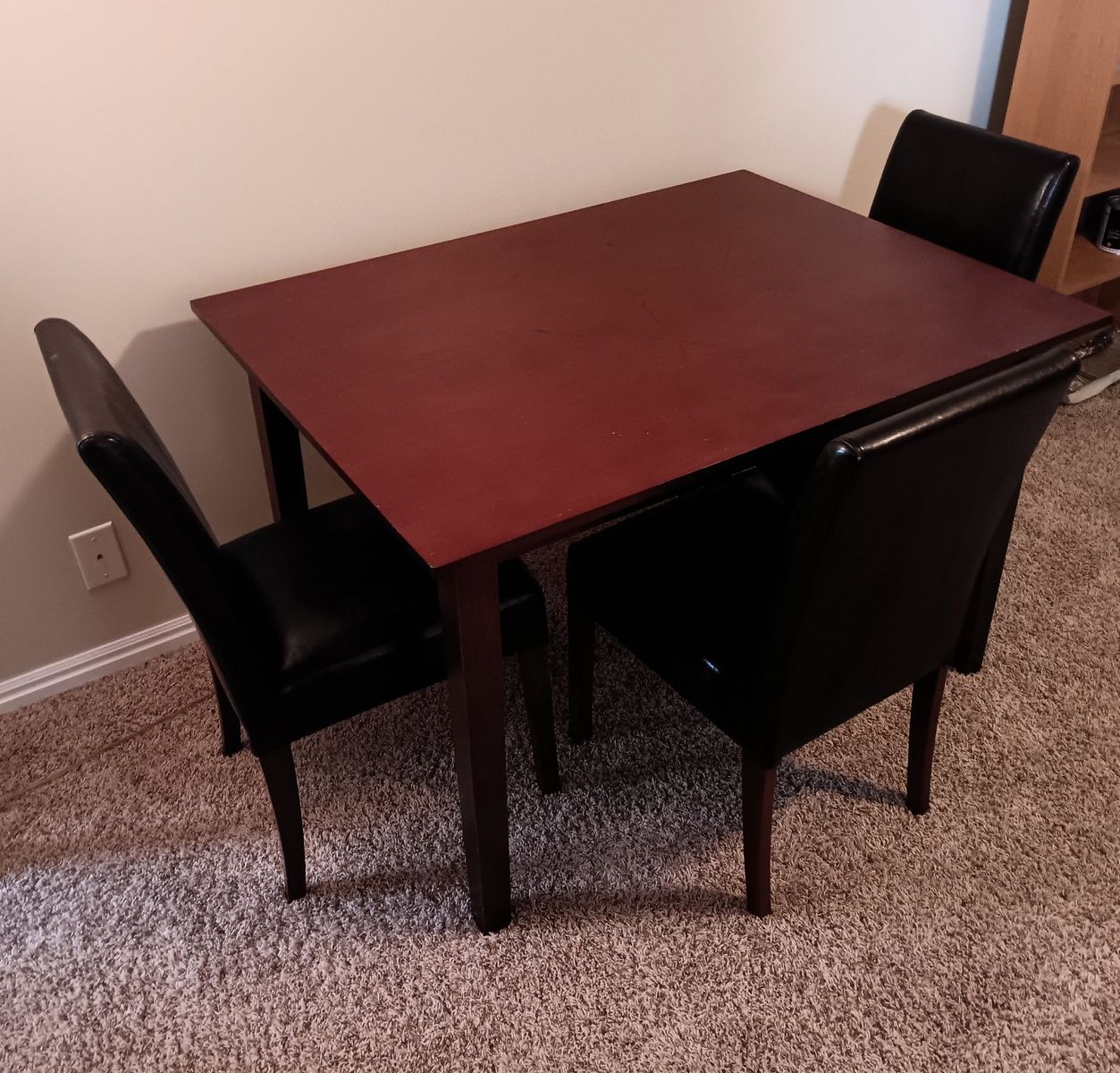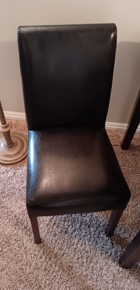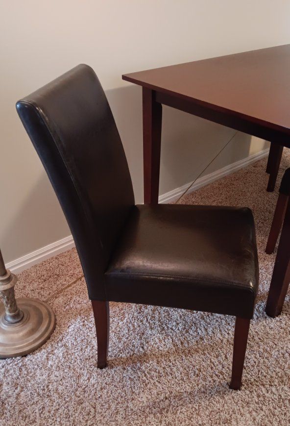 VenmoDinning table and 3 chairs, table is solid wood and the chairs are leather like covered. Table is 30 inches tall and 47 x 35 for the top. Over all it's in good shape, chairs and table are solid. $ 40 for all of it.