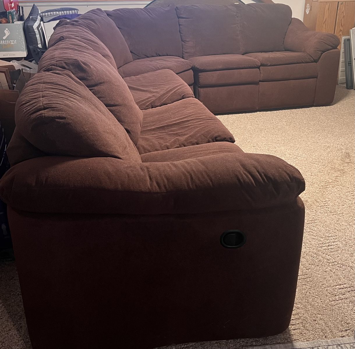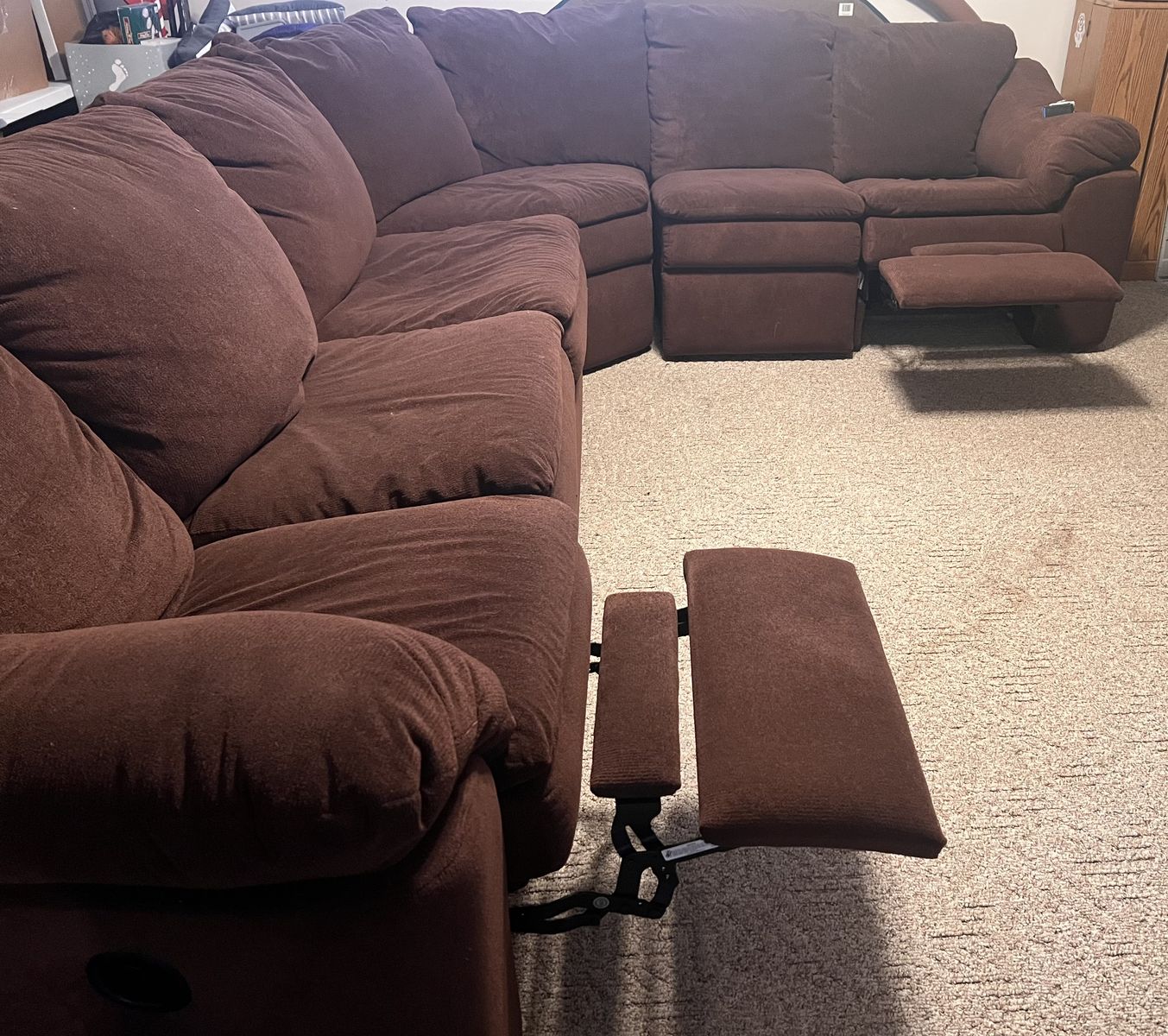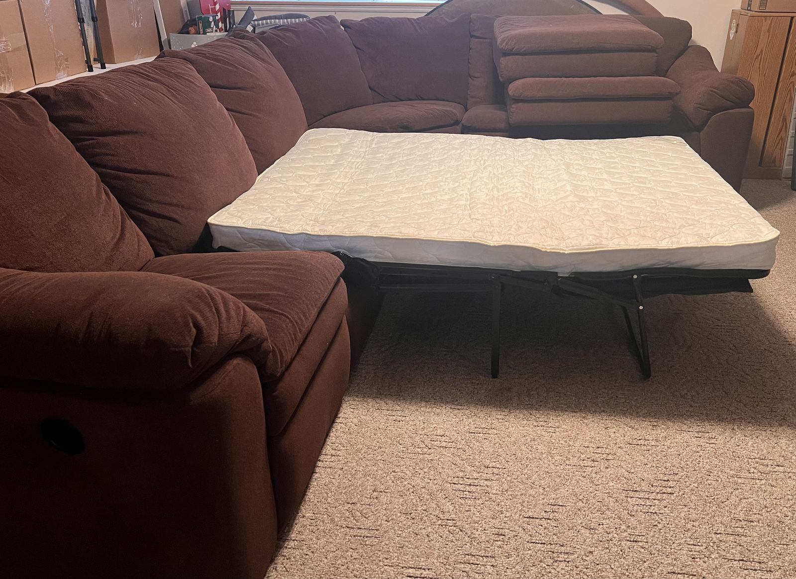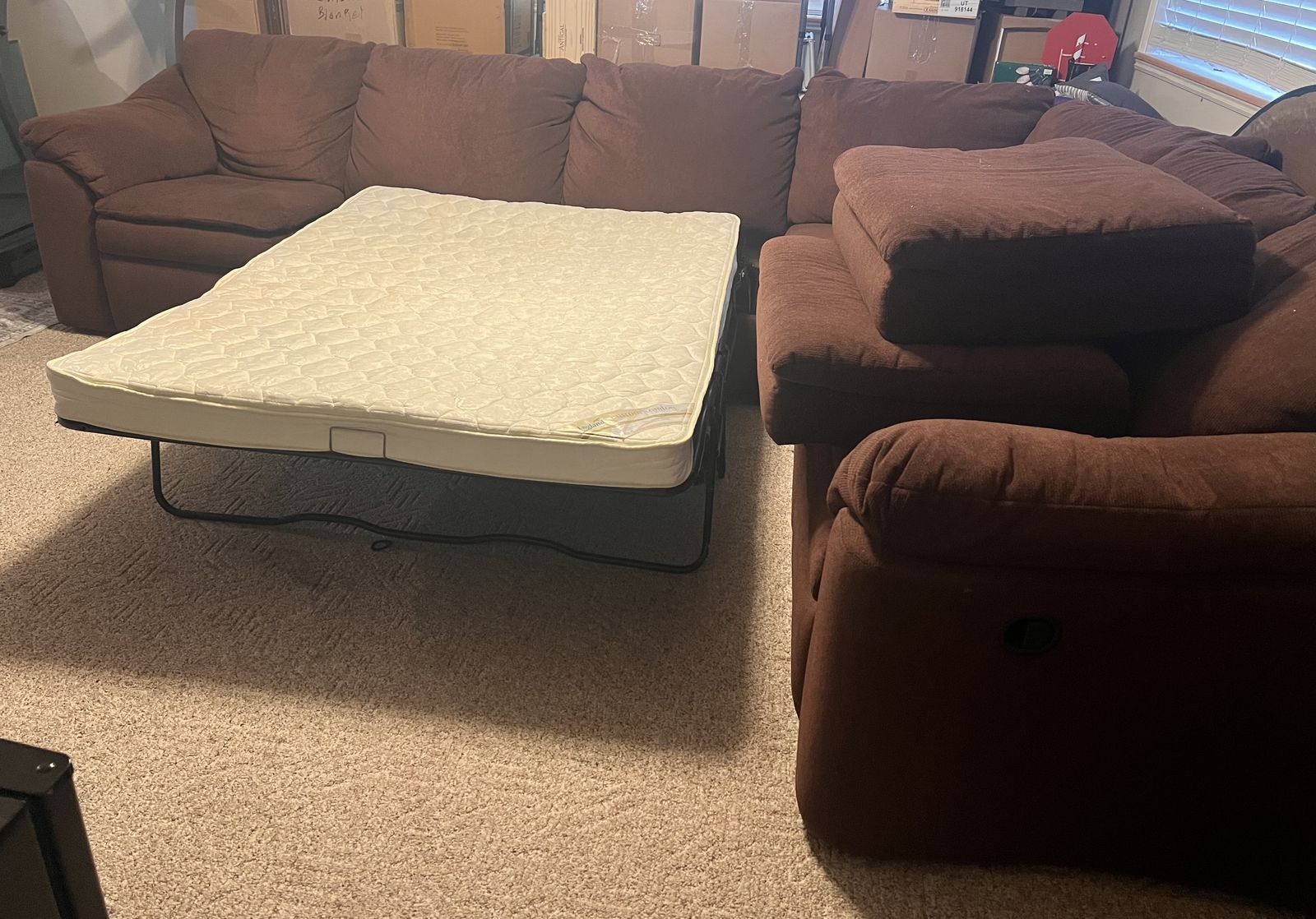 Brown microfiber sectional with sleeper bed and 2 recliners