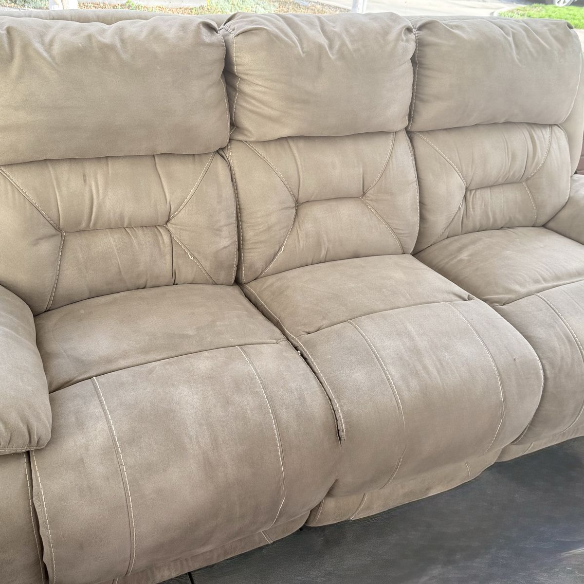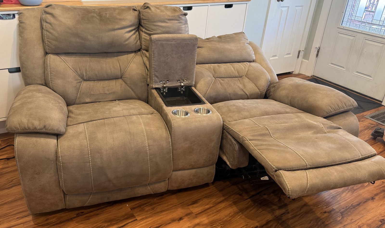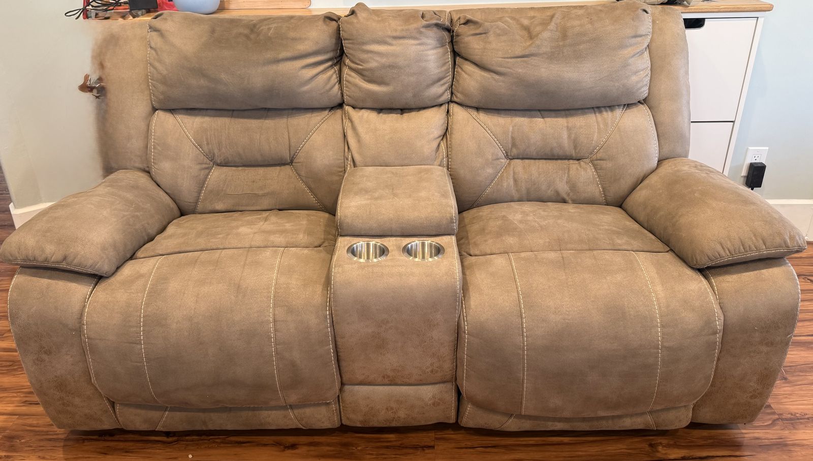 Venmo$750 for the set OBO Well loved, still in good condition with some small tears. I’m a home with dogs. Fabric: Microfiber Color: Gray Couch: seats three, both end seats become recliners, power buttons for feet and headrest as well as USB port are discretely placed on either side. Loveseat: seats two with a small storage console and two stainless steel cup holders in between the seats, both seats become recliners, power buttons for feet and headrest as well as USB port are discretely placed on either side