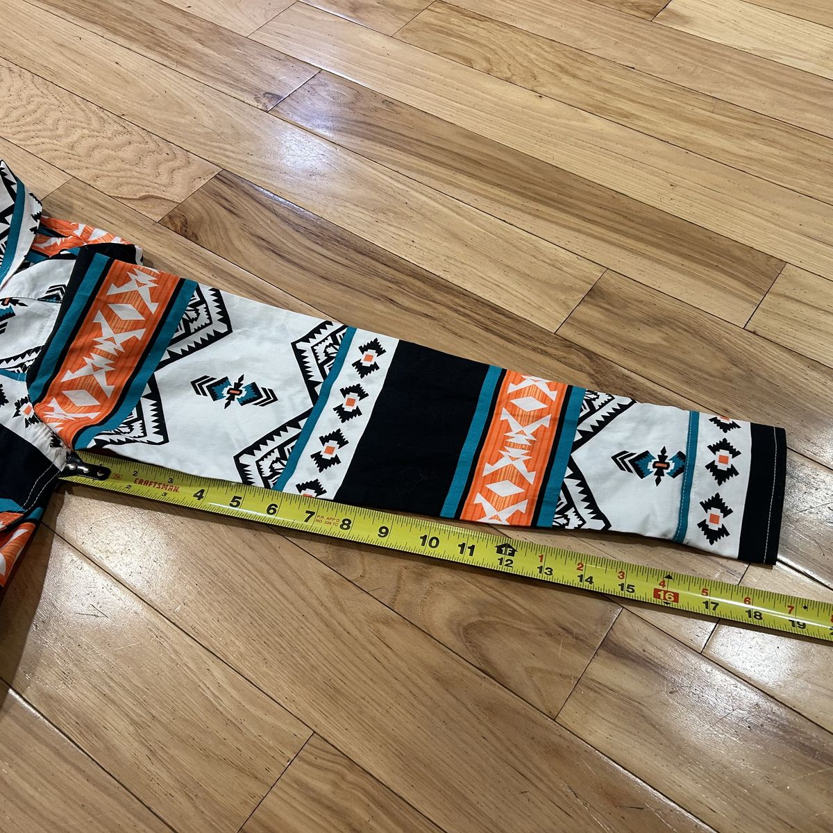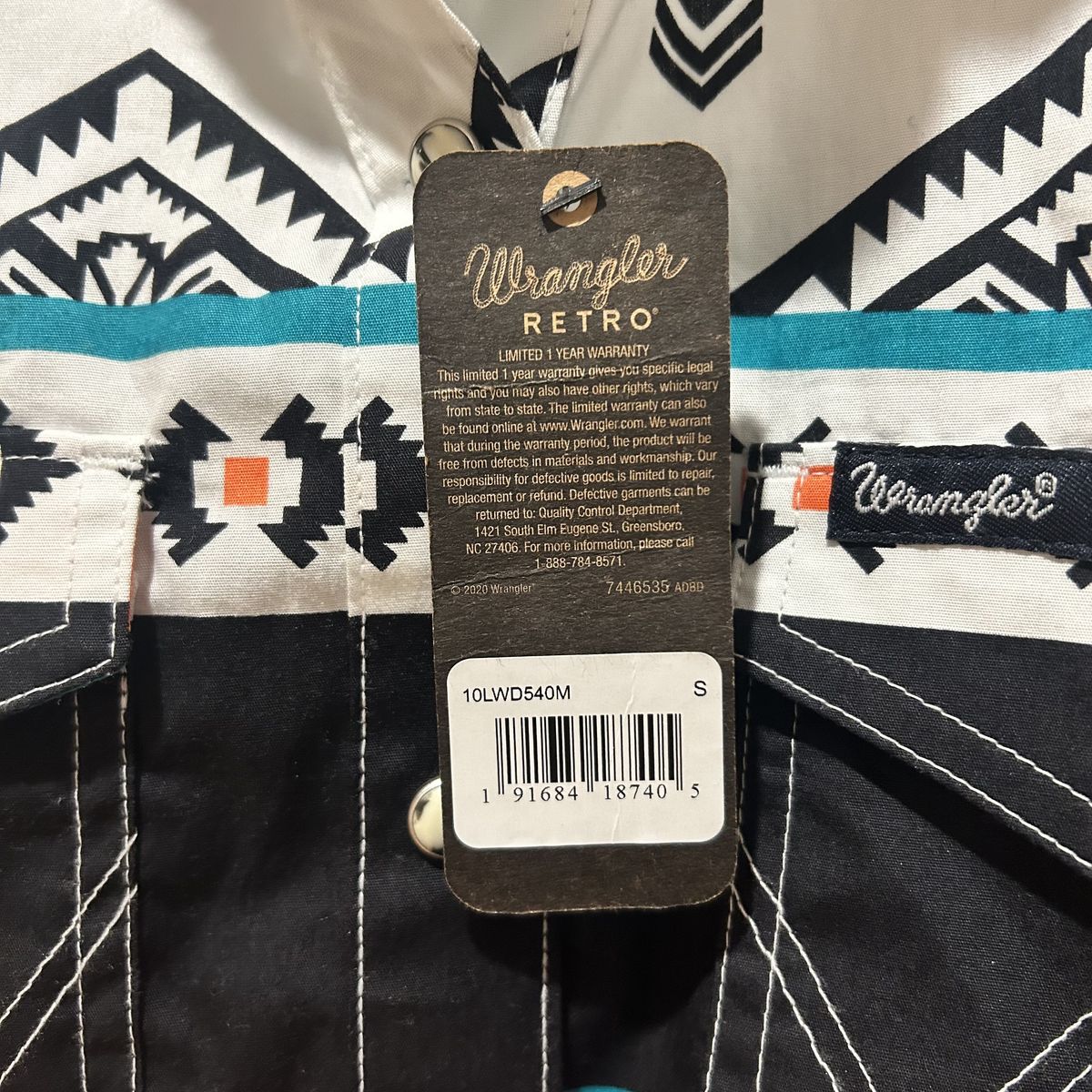 Wrangler NWT Retro Aztec Southwest Snap Front Blouse Shirt Midi Dress - Women’s Size Small - geometric design colors include white, black, orange and teal - collared, long sleeve and with pockets - brand new with tags.