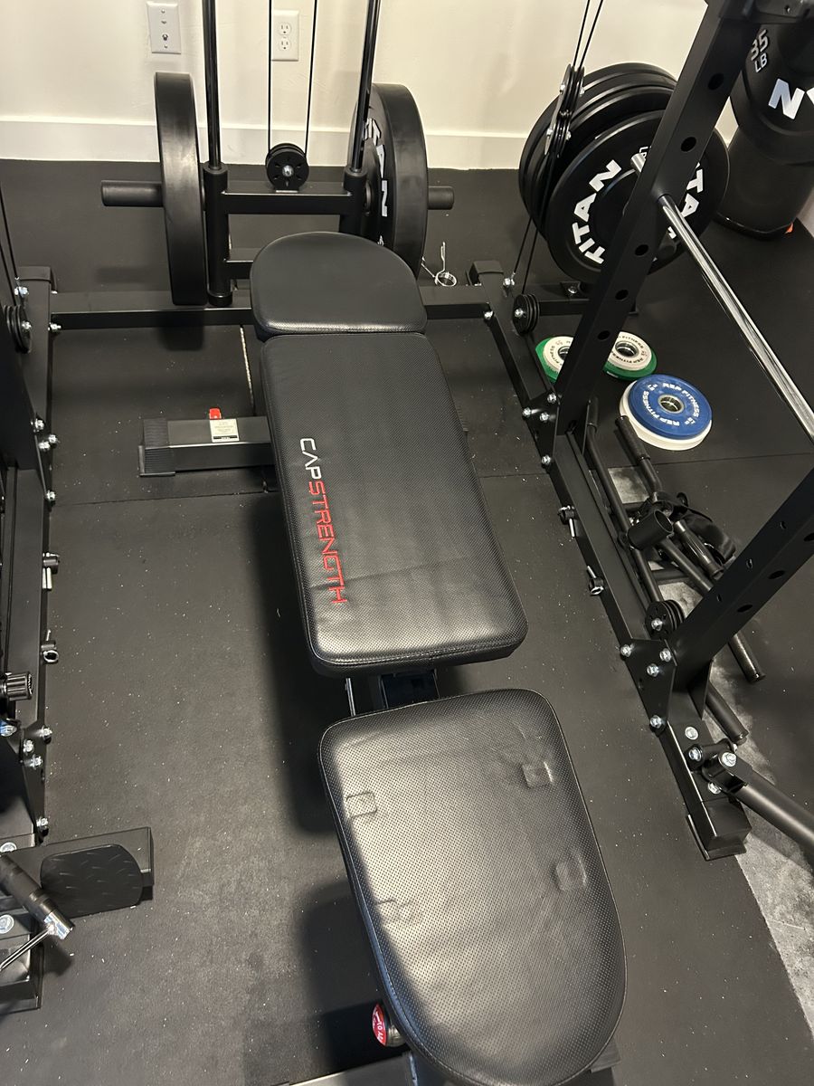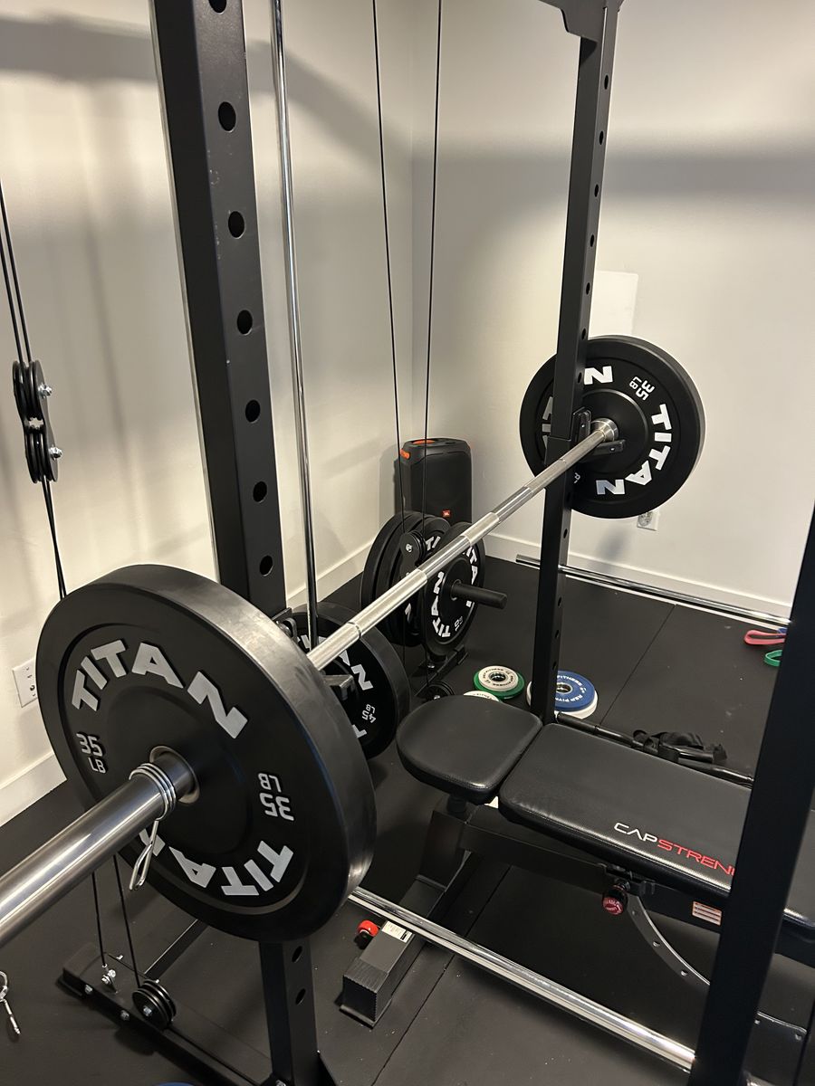 • Major Fitness Squat Rack with pulley system • Rogue Ohio Power Bar (45 lb bar) • CAP Strength Adjustable Bench • Titan Bumper Plates:\