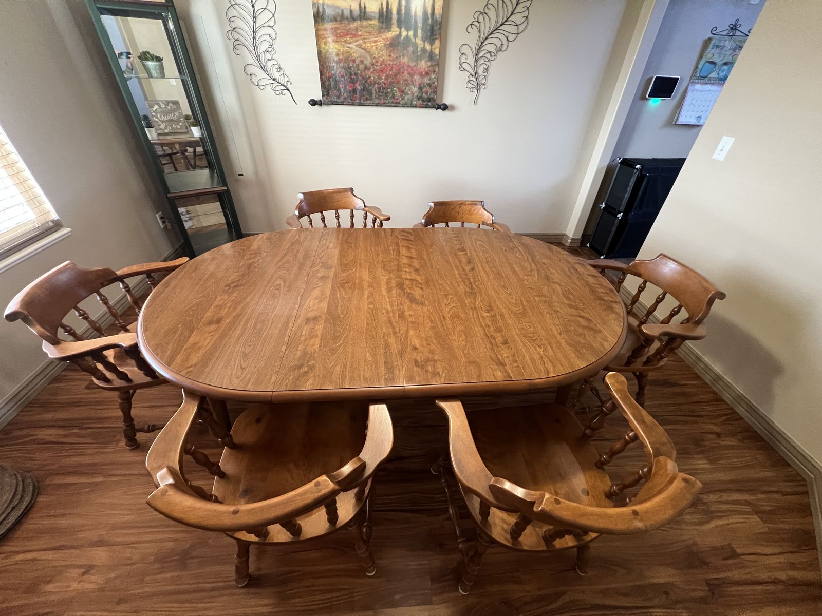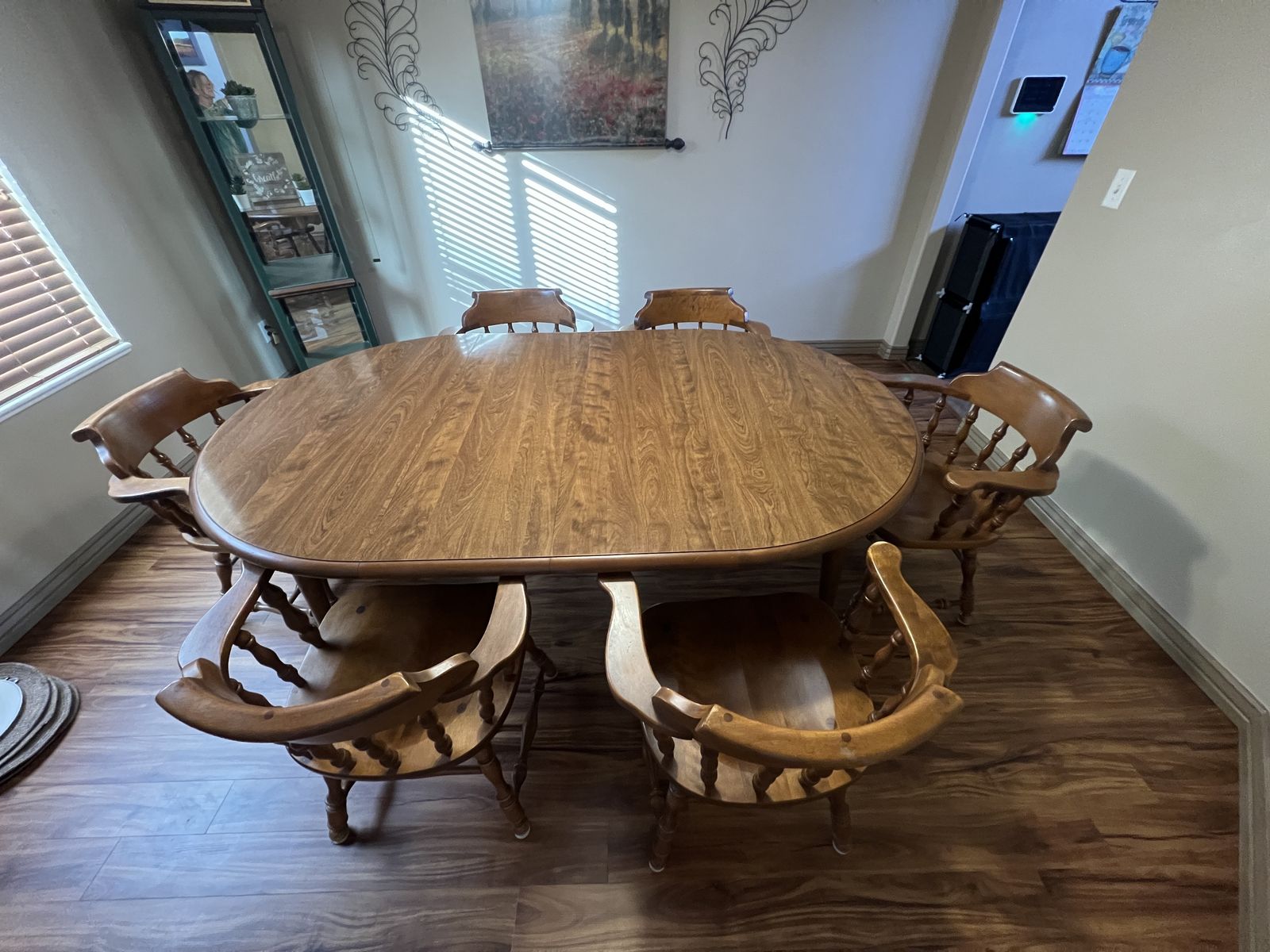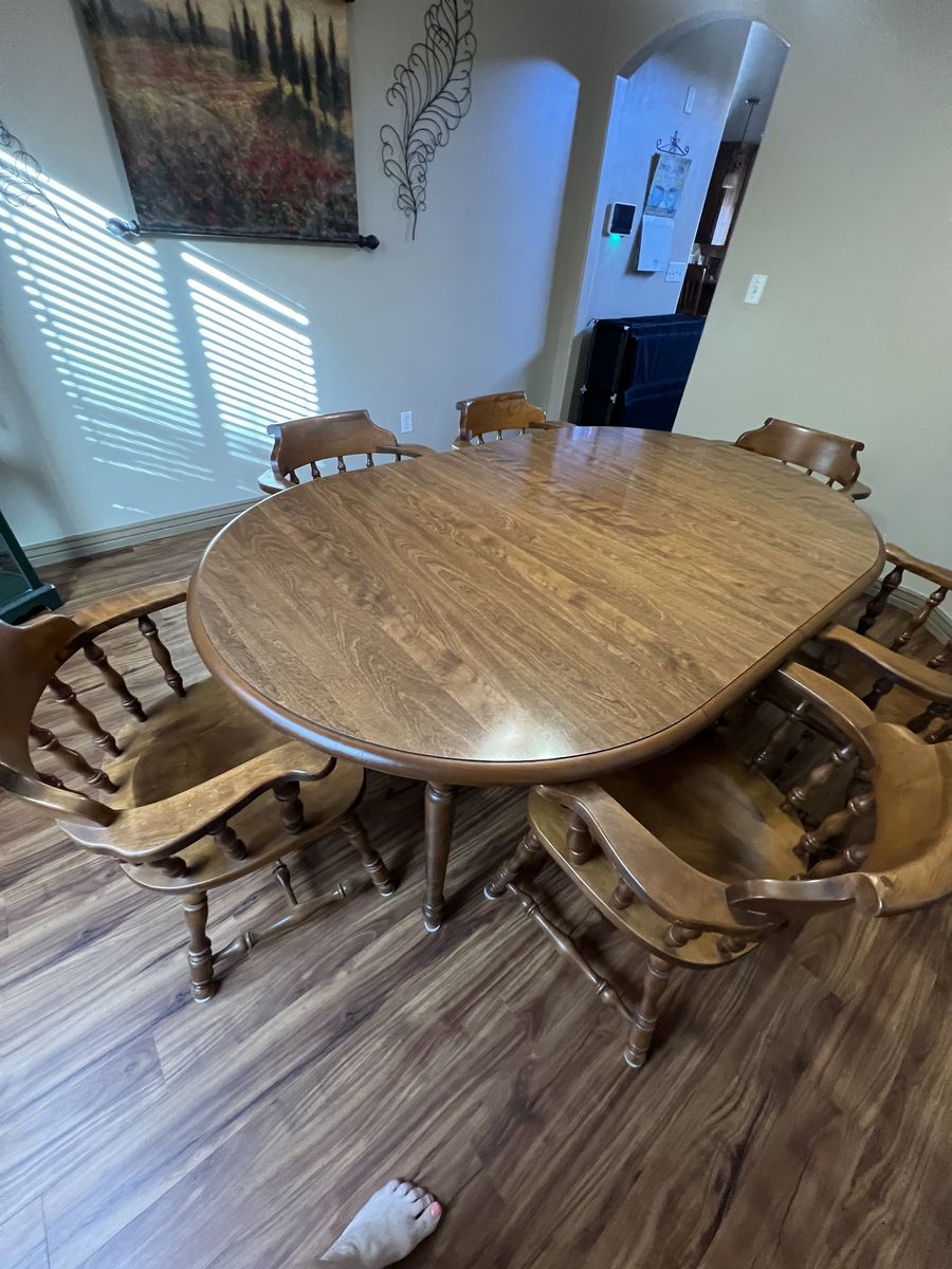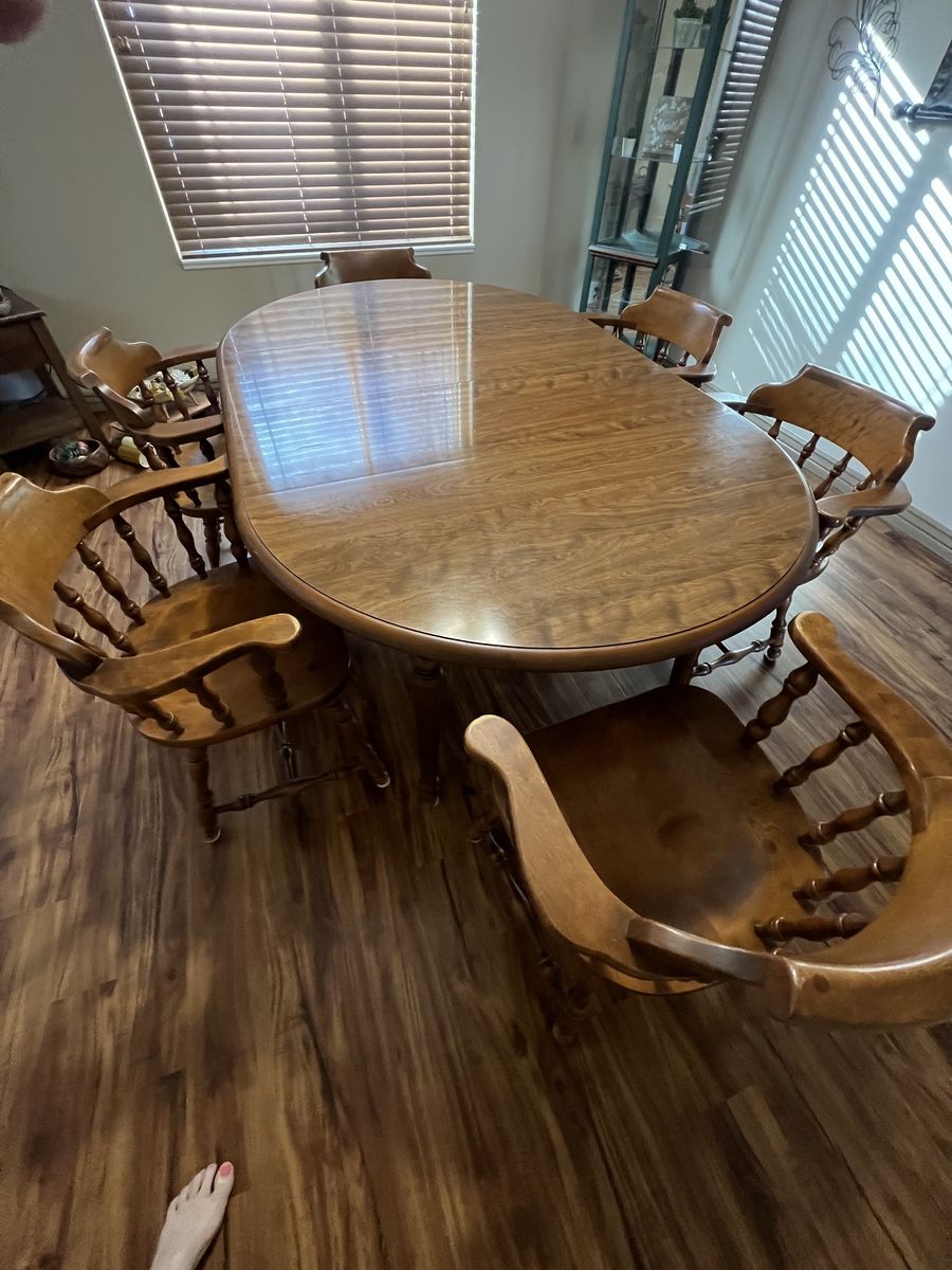 Venmo9 piece Vintage Nutmeg Heirloom Dining Set. Excellent condition original owner. Includes 6 captain chairs, large oval table with 2 additional leaves to expand. Must see. Asking $2000