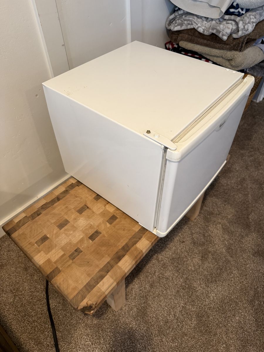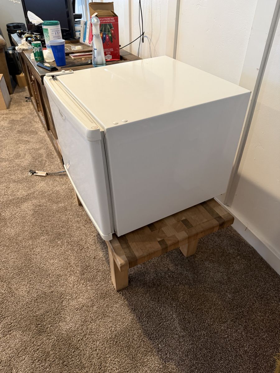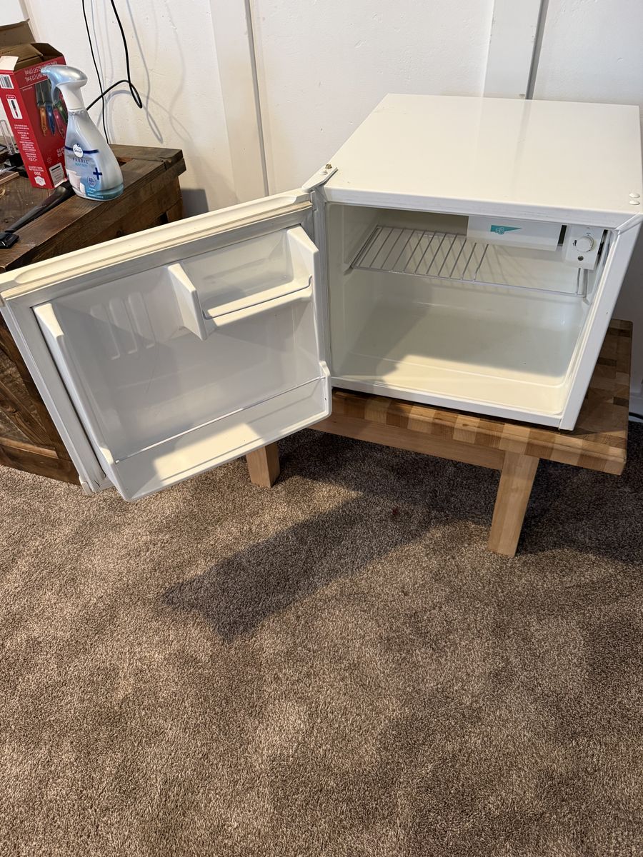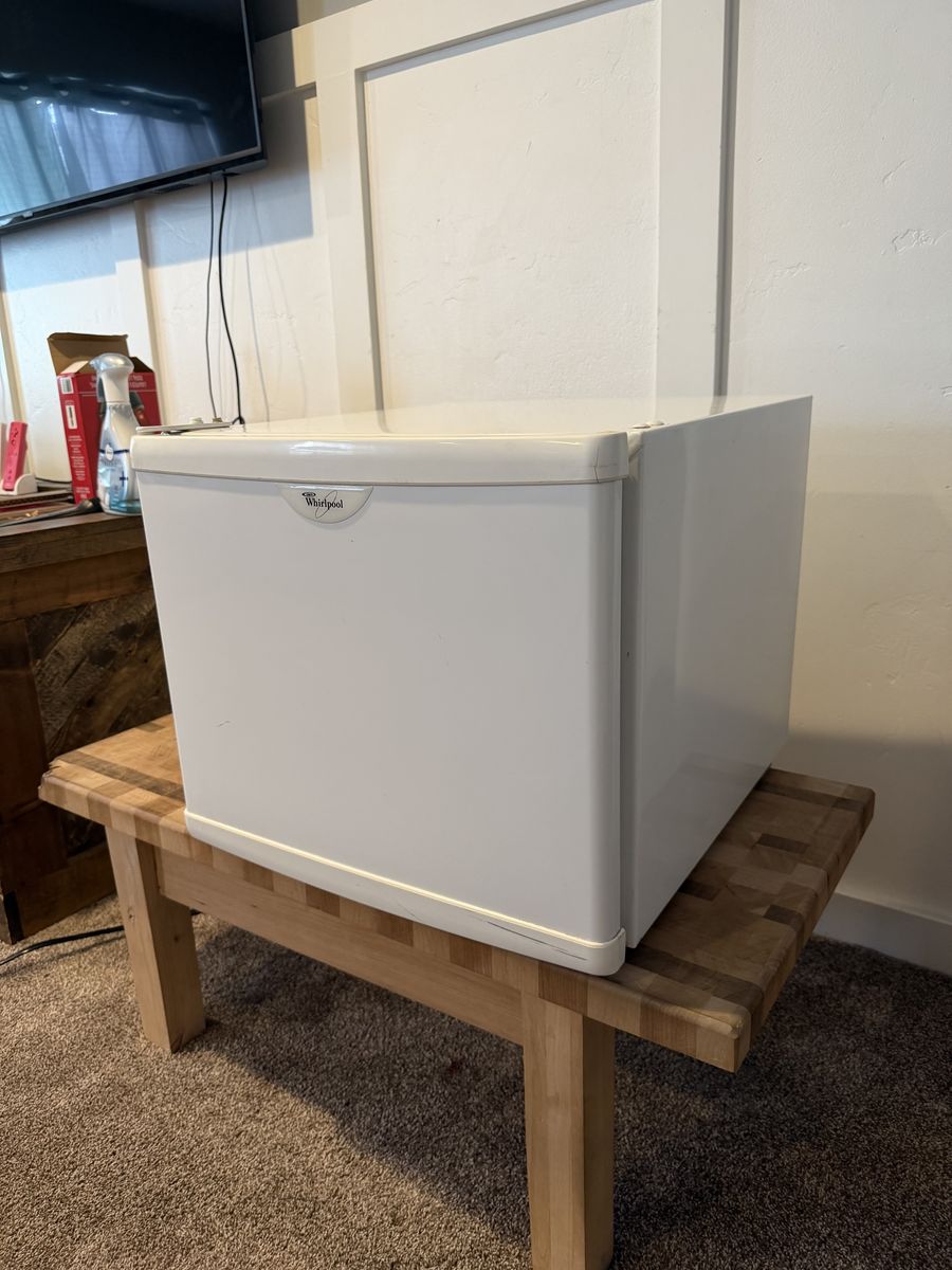 Whirlpool compact mini refrigerator in good working condition. Great size for a bedroom, dorm room, office, garage, or game room. Keeps drinks and food cold and runs quietly.