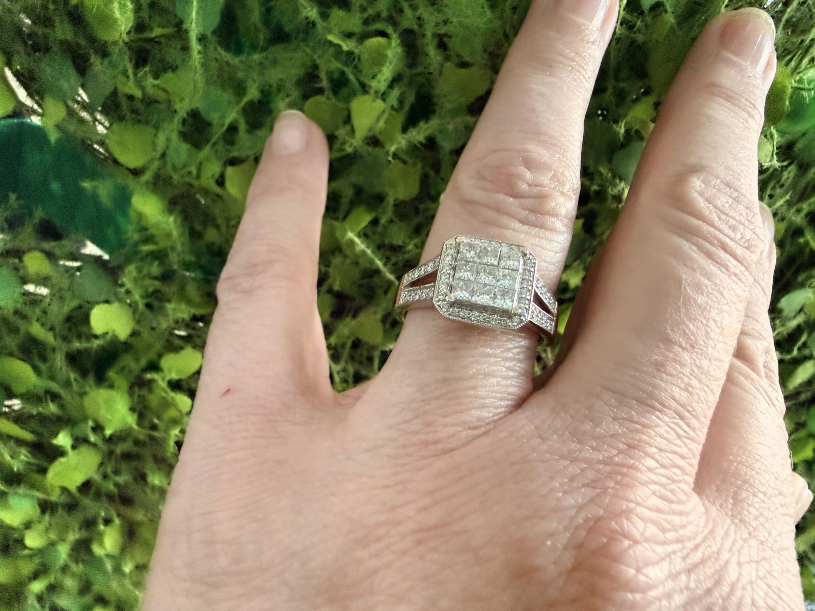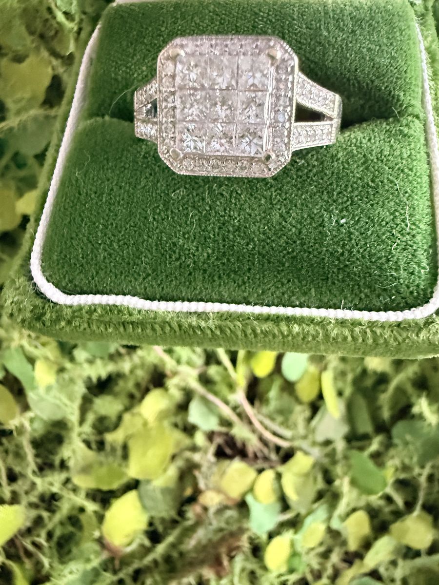 Venmo14 kt white gold cast engagement ring with a polished finish. Nine invisible set princess cut diamonds weighing .87 CT. 24 pave set round brilliant cut diamonds weighing .09 CT. 20 pave set round brilliant cut diamonds weighing .16 CT. Total weight of diamonds: 1.11 CT. Total weight of ring: 5.40 GM. Value of ring: $1,676.48. Asking price: $800. Ring size: 7 3/4.