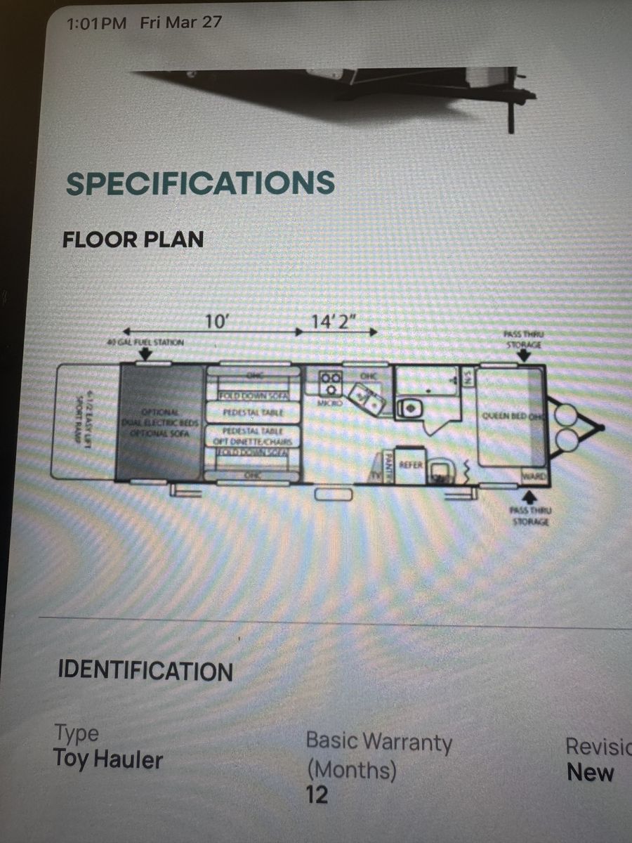 On board generator, 2 Captain chairs, fuel station, pass through storage. Sleeps 6-8 people queen bed in front, electric bed and couch/bed in back
