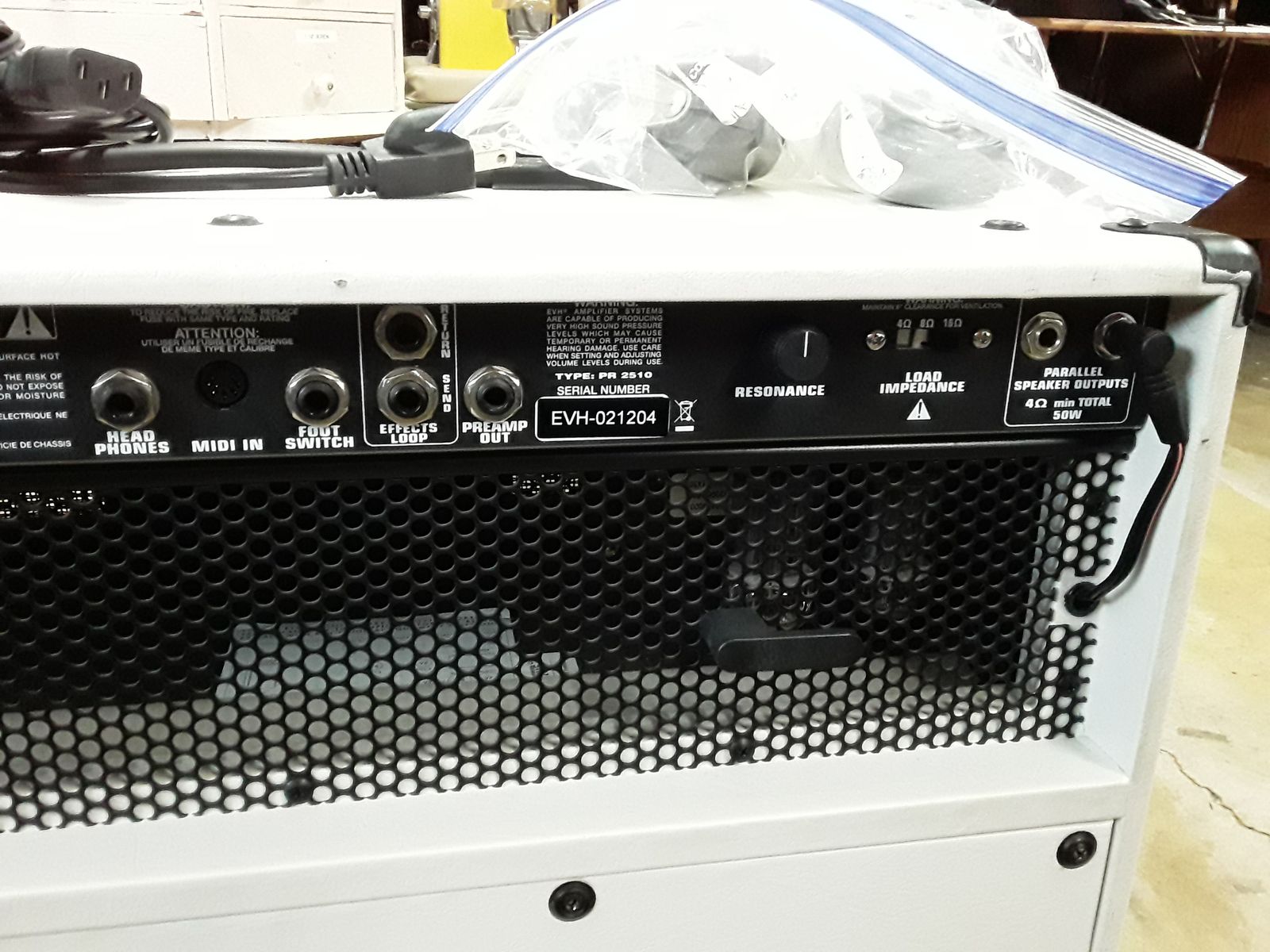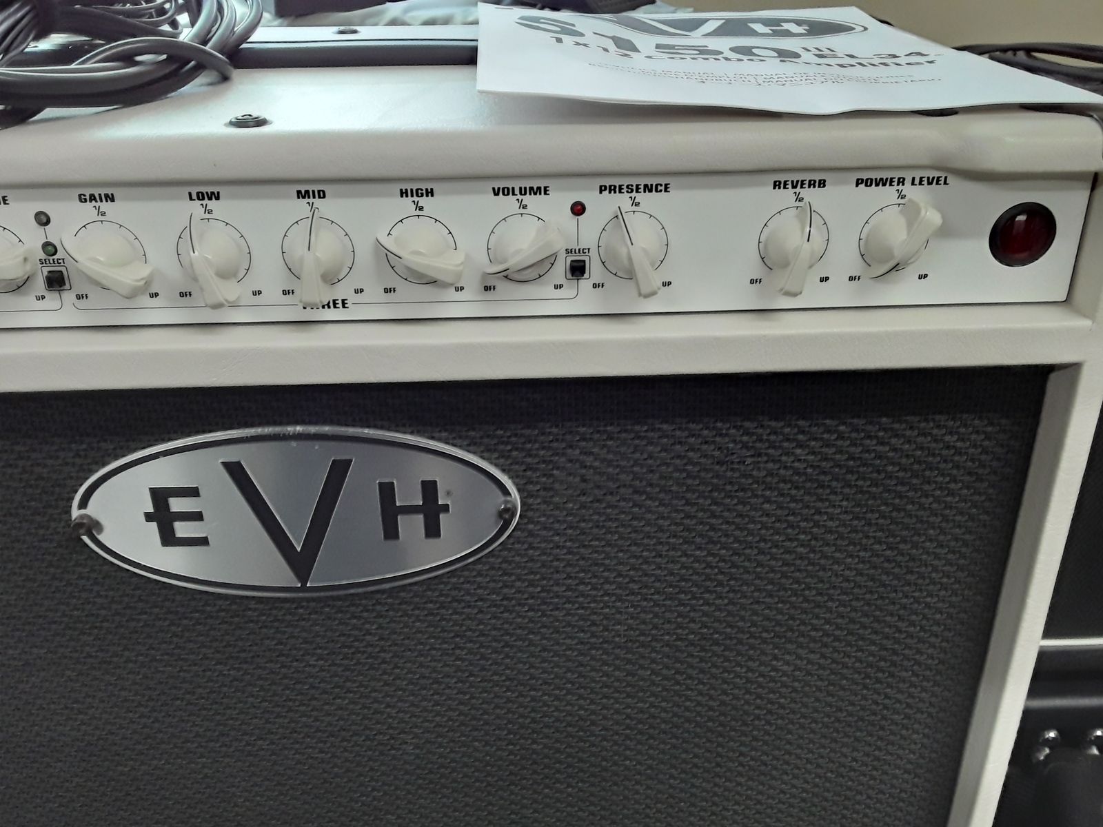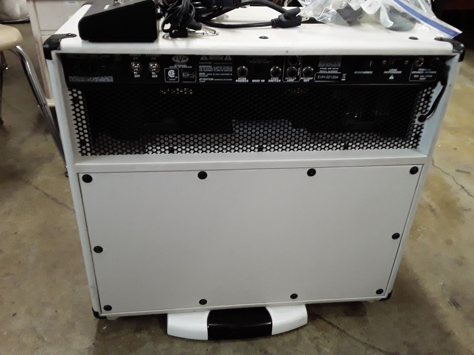 So many options on this baby. Built in power soak to save you ears from bleeding, Presence, Resonance (on back), Reverb, scalable speaker matching (16,8,4) for any extenal cabs you want to hook up, Gain on each channel, midi, headphone hookup, effects loop. All Led's work on amp and footswitch. Footswitch tested. Casters to save your back,,,nice. All original. White is very classy.