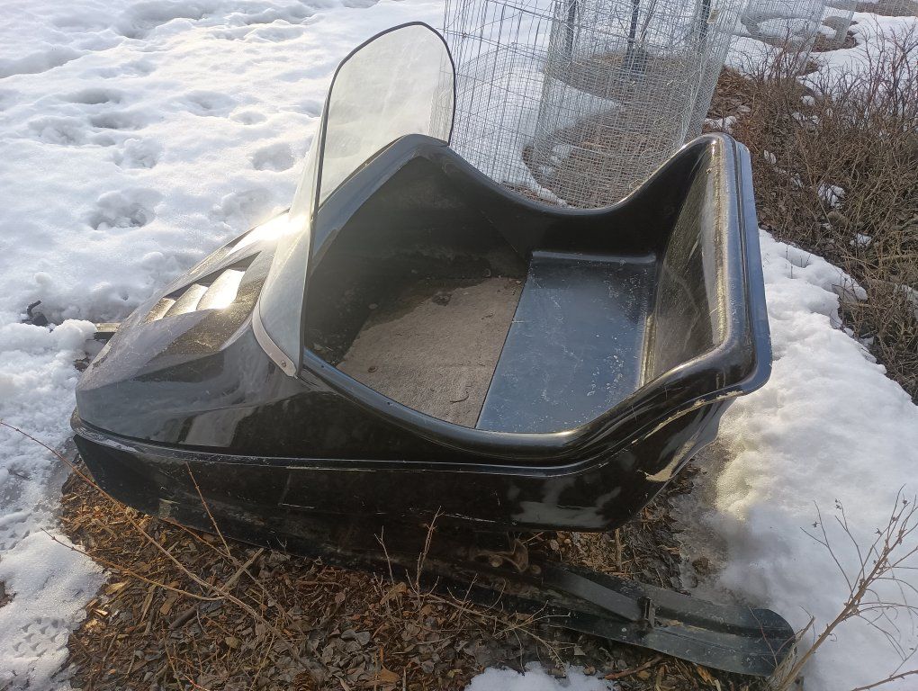 cool little trailer to pull behind a snowmobile or four wheeler in the winter has a seat and a windshield is fun for pulling kids around or taking them sledding