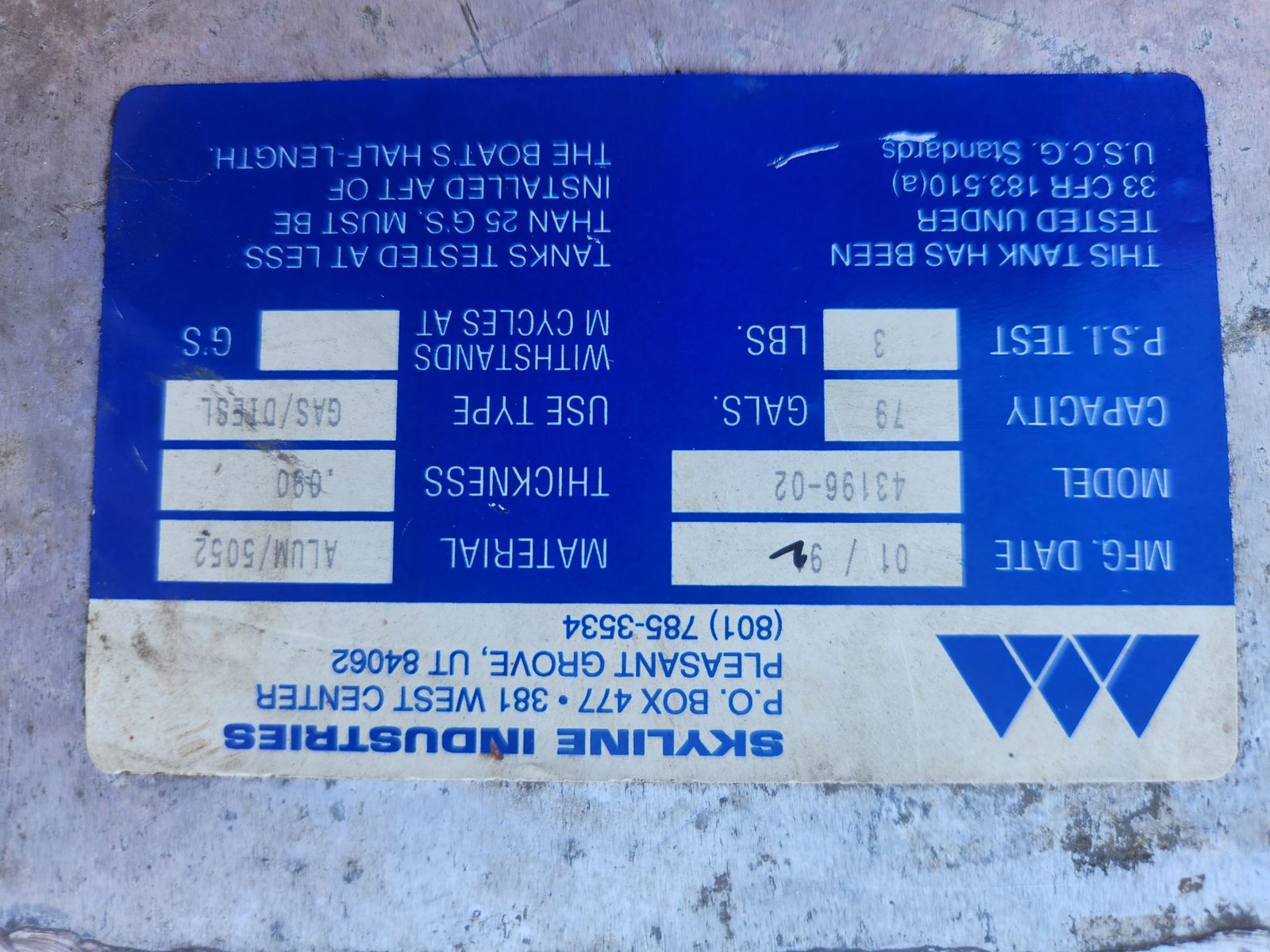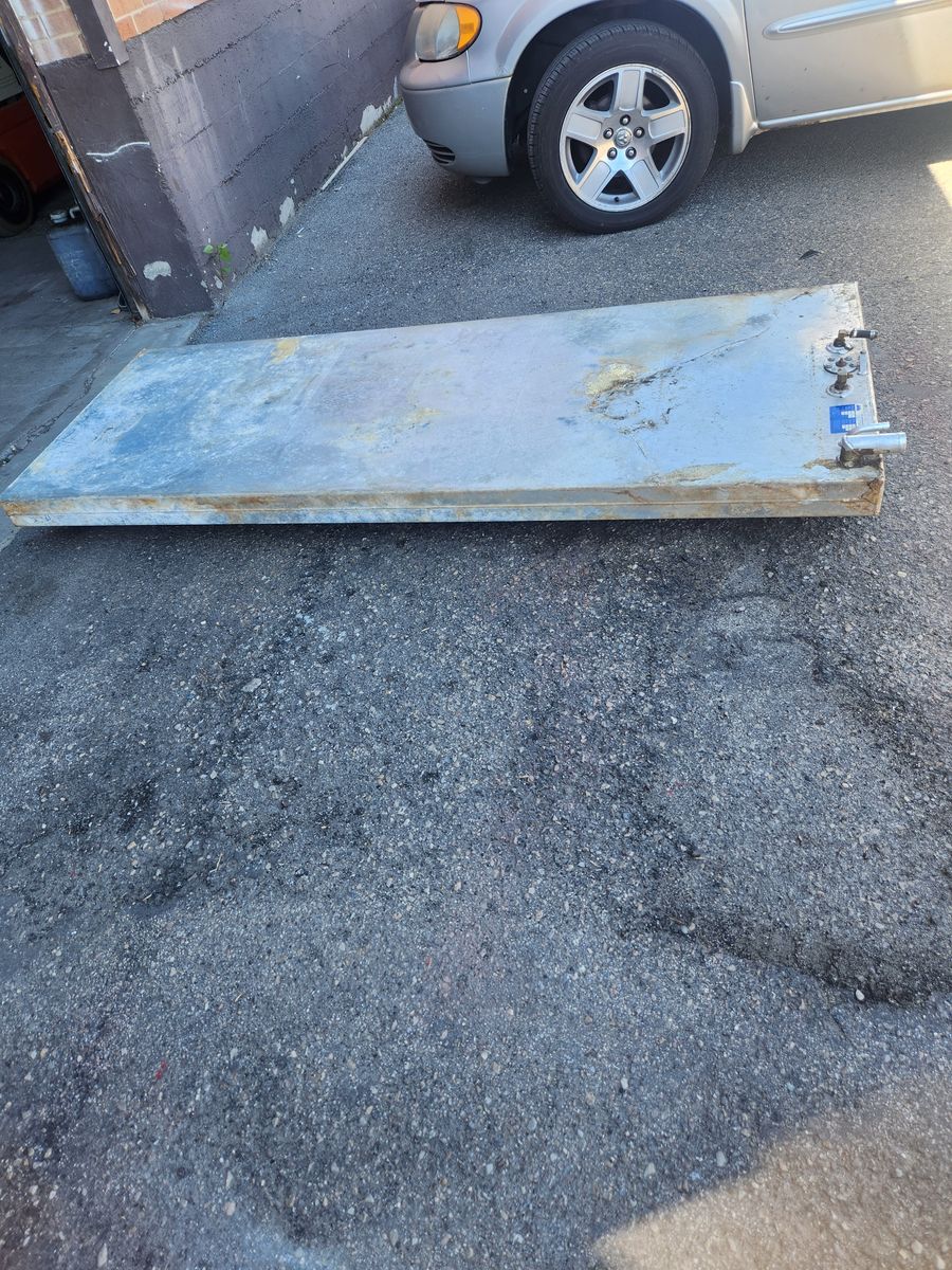 This is the 78 gl Aluminum Gas tank that came out of a boat that had to go to the junk yard. The tank as no dents cracks or leaks.Two pick up tubes, one vent, and the fill tube. It has a modified V shape that fit in the hull of the boar but can be used as an auxillary tank for many applications. Certified gas or diesel.