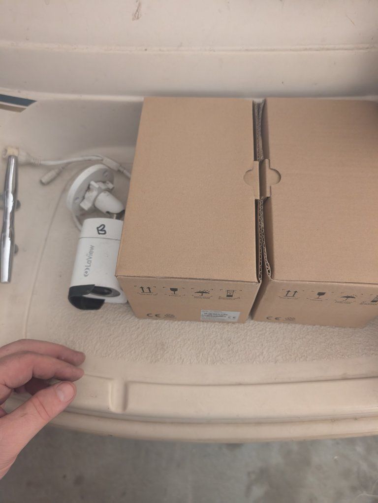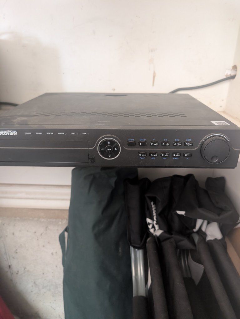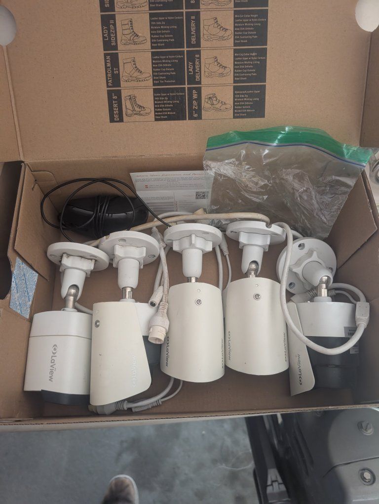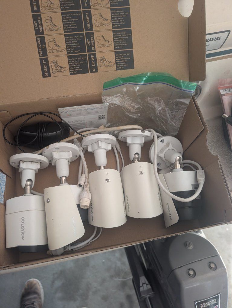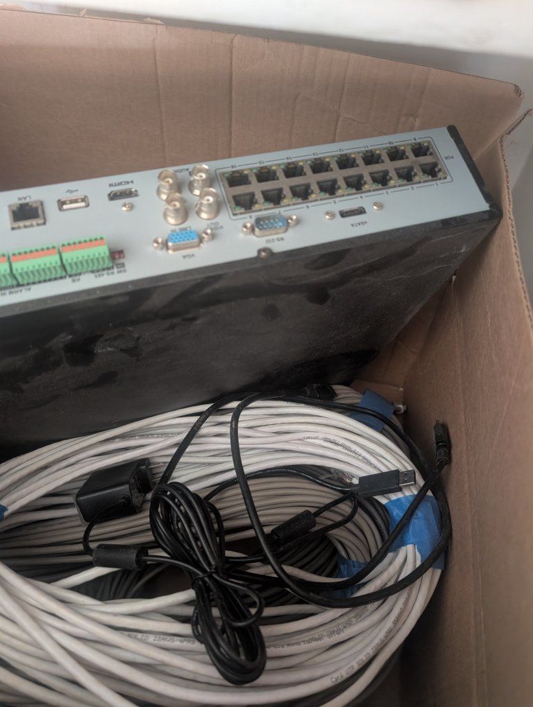 complete setup. eight cameras and all the cables and hardware needed to start it up, including instruction book can be expanded to 16 cameras if you want to buy more online. somewheres. I bought it a few years back thinking I would put it up but now I'm 75 years old and shouldn't be climbing on a ladder