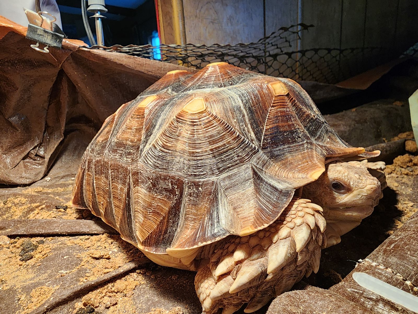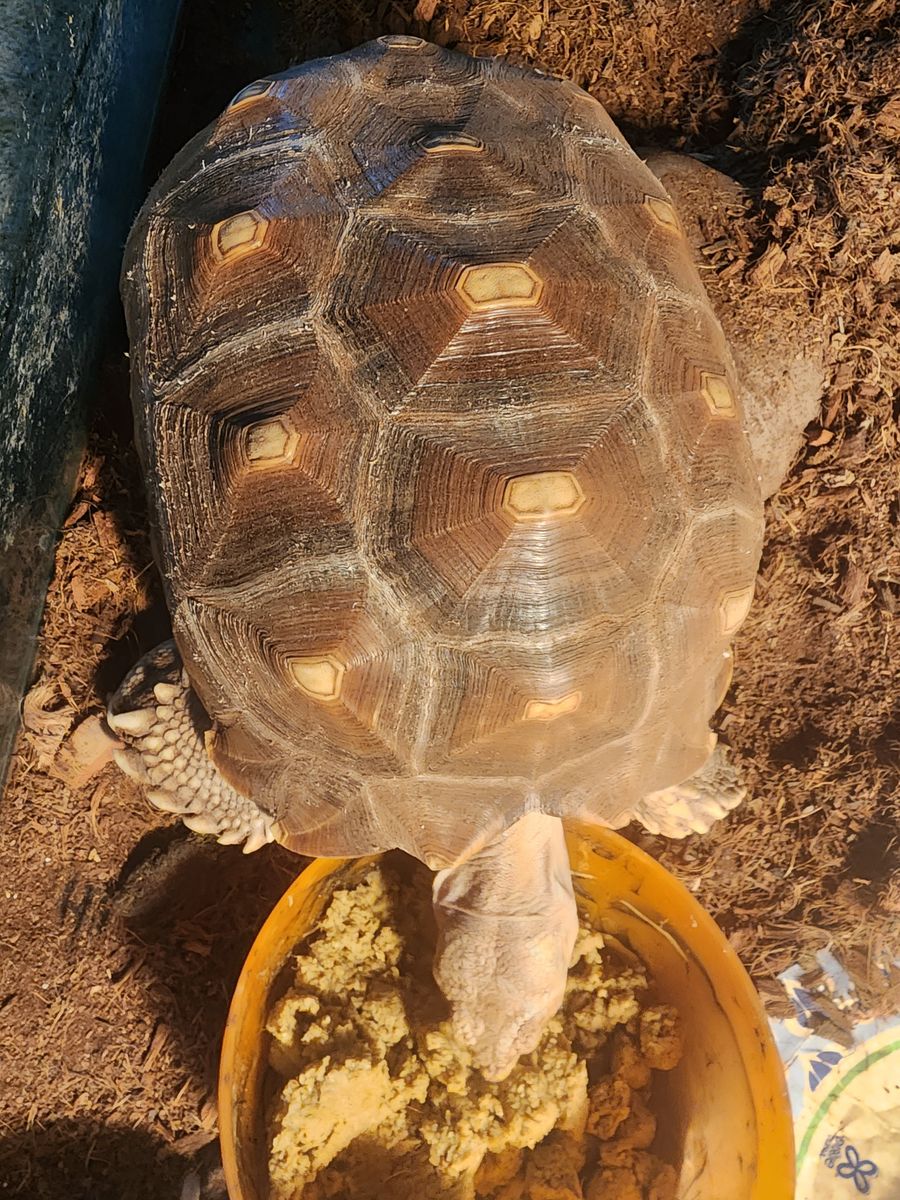VenmoReptar is around 4-5 yrs old (estimate), our guess is male, comes with a bag of mazuri tortoise food and light. No enclosure.