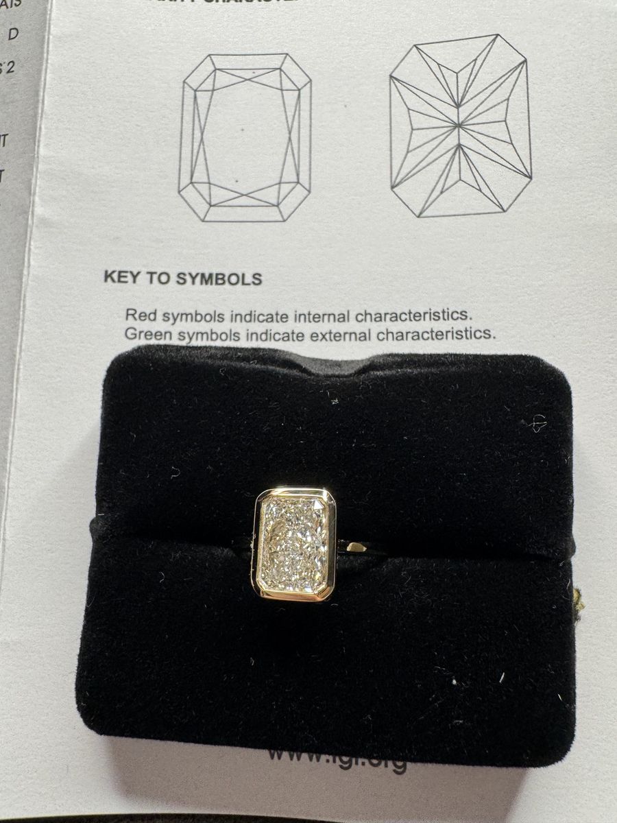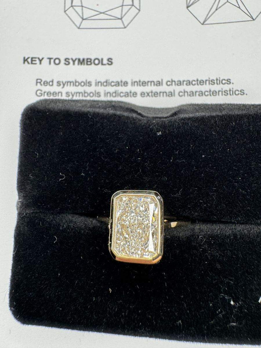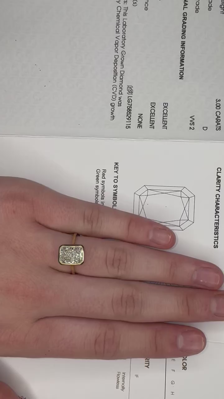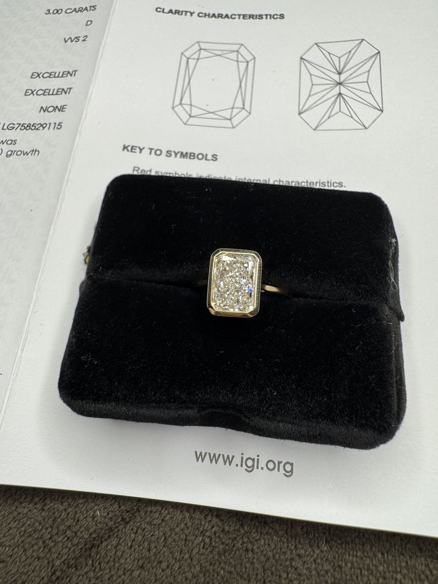Size 6 - Stunning 18K gold with a bezel set cornered rectagular modified brilliant 3 ct lab grown diamond. Color grade D with a clarity grade VVS2. IGI report included.