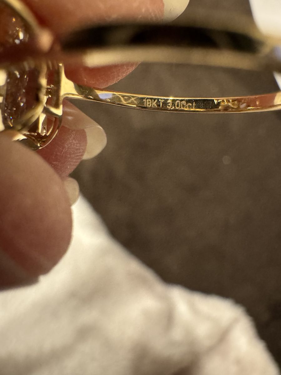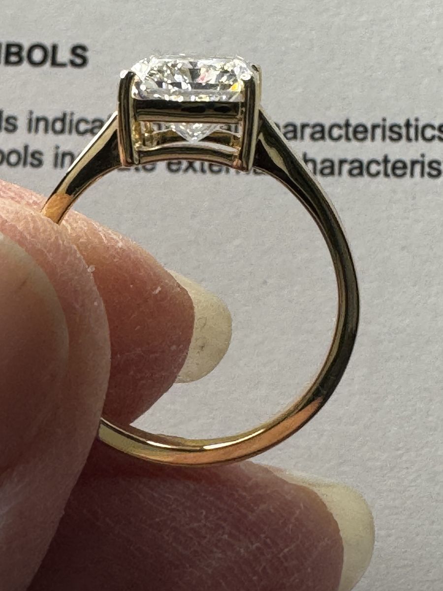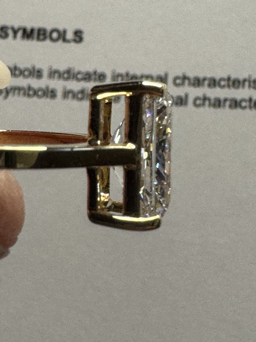 Size 6 - Stunning 18K gold with a bezel set cornered rectagular modified brilliant 3 ct lab grown diamond. Color grade D with a clarity grade VVS2. IGI report included.