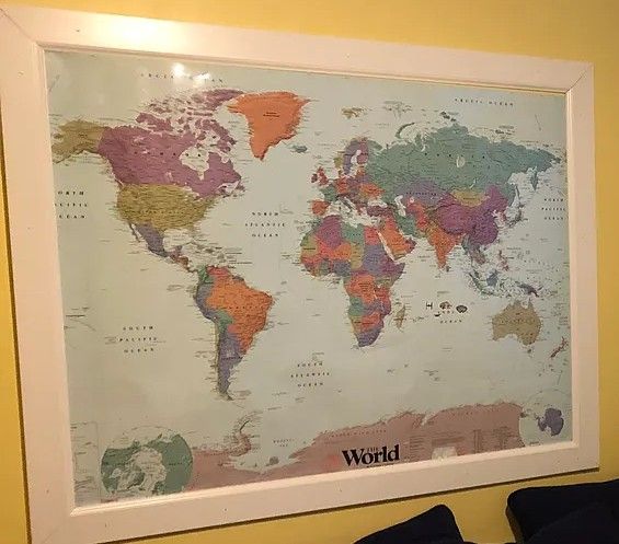 White frame mounts directly to the wall around a poster or other print. Print/poster dimensions would be 48 by 36 inches. Was originally used for a world map (map not included).